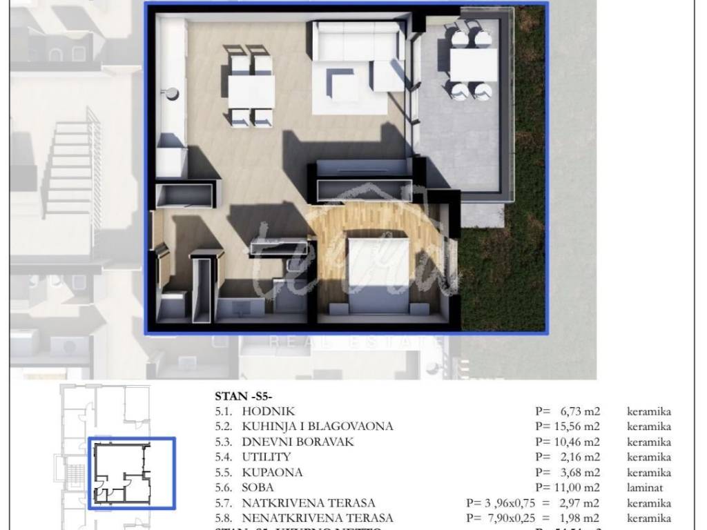 Total area of 54.54 square meters, consists of a hallway, one bedroom, kitchen, dining room, living room, bathroom, utility room and two covered terraces.