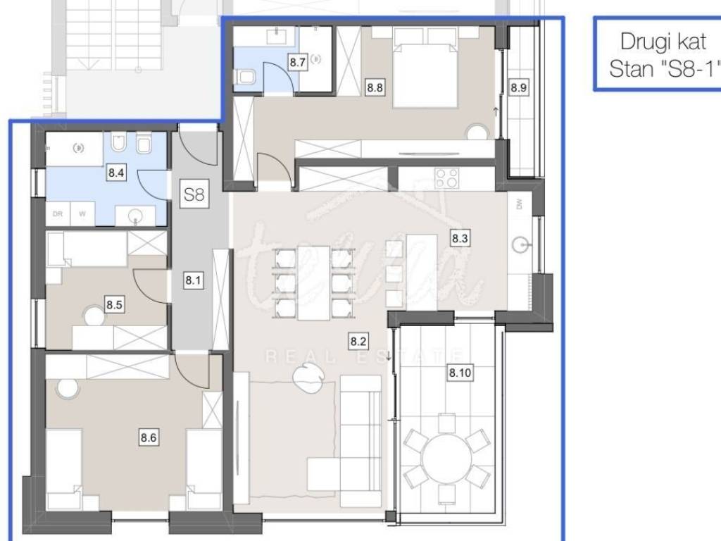 Total area of 108,83 square meters, consists of a hallway, three bedrooms, kitchen, dining room, living room, two bathrooms and two covered terraces.