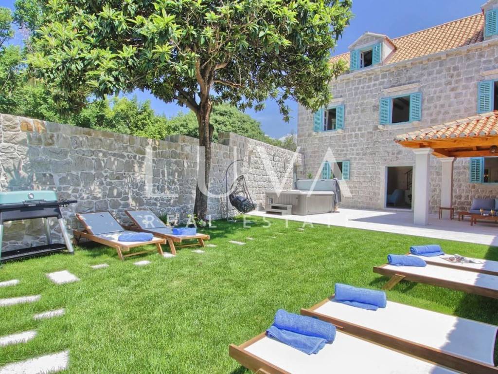 A luxury house near the sea for sale in Cavtat. Cavtat is a charming and quiet town near Dubrovnik, well-connected with an airport nearby. This luxury house is located in the heart of Cavtat, on the peninsula, just a few minutes' walk from the sea. The property spans 100m², fully enclosed by high stone walls for privacy. In front of the house, there's a covered terrace with a corner lounge set, a Jacuzzi, an outdoor shower, a barbecue, and sun loungers.