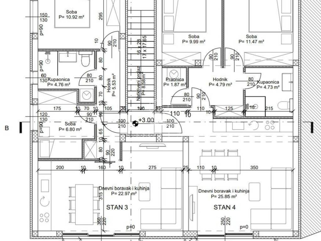 koji se sastoji od : spavaća soba 1) površine 9,99m2, spavaća soba 2) površine 11,47m2, kupaonice površine 4,73m2, hodnika površine 4,79m2, kuhinje spojene sa dnevnim boravkom površine 25,85m2, praonice površine 1,87m2 te terasa površine 3,79m2.