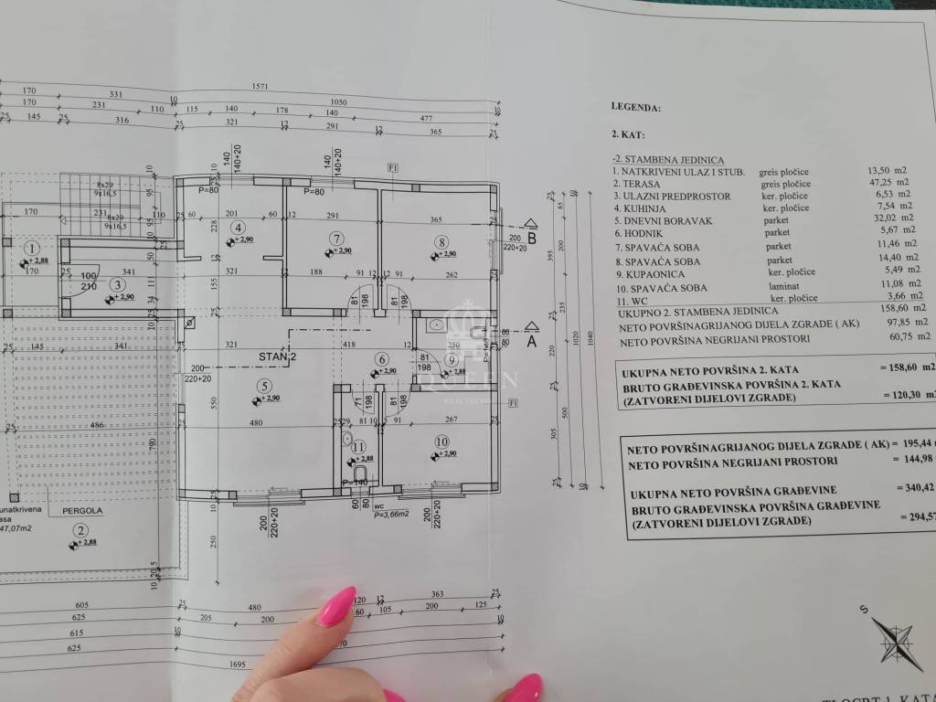 Stan 2) stan na prvom katu- sastoji se od 3 spavaće sobe, kuhinje spojene sa dnevnim boravkom, kupaonice, toaleta, hodnika te prostrane terase sa koje se pruža pogled na zelenilo. također vlastita garaža ( garažno mjesto) i jedno vanjsko parkirno mjesto. Površina stana 158m2 + 16,5m2 garaža, cijena 270.000eura