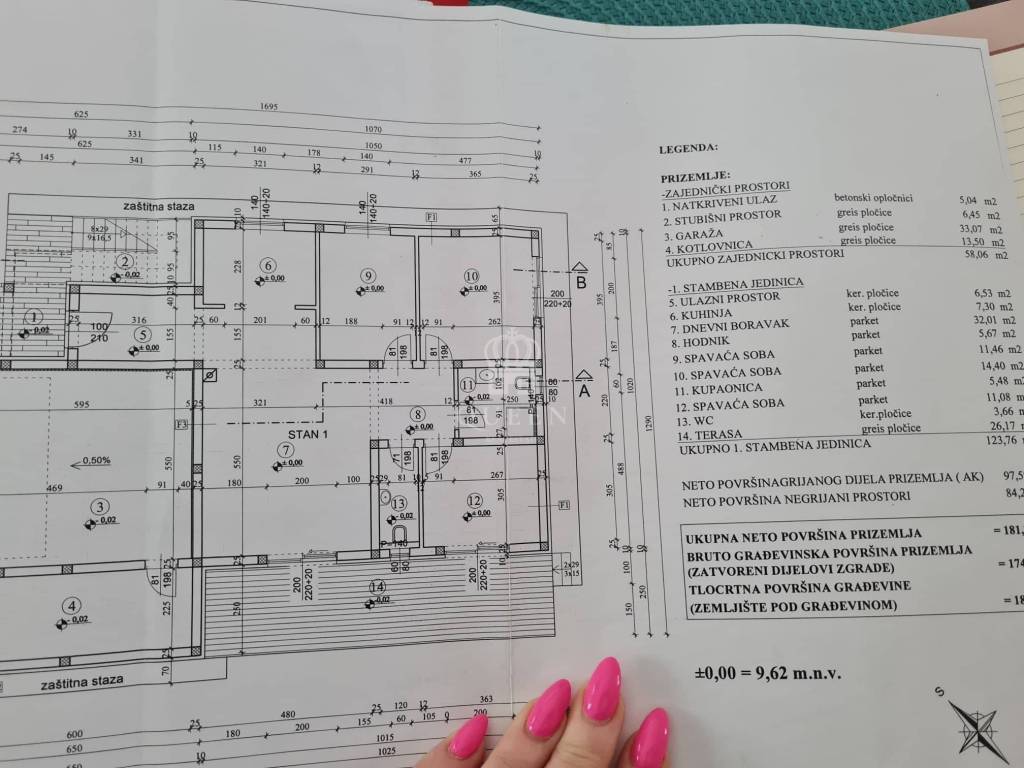Stan 1) u prizemlju - sastoji se od 3 spavaće sobe, prostrane kupanoce, toaleta, kuhinje spojene sa dnevnim boravkom, terase, garaže te dio privatnog vrta, cijena 270.000eura, površina stana 123,76m2 + garaža 16,5m2