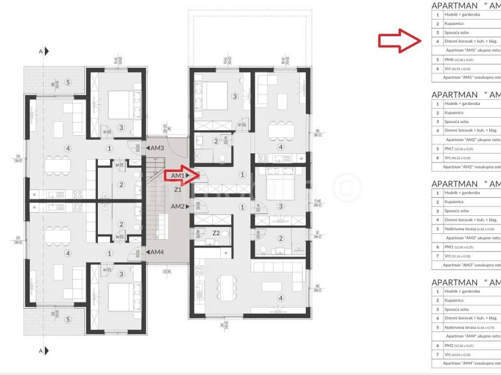 Apartman (AM1) se nalazi u prizemlju te se sastoji od ulaznog hodnika , 1 kupaonice, 1 spava��e sobe, dnevnog boravka, kuhinje i blagovaonice sa izlazom na privatnu oku��nicu (vrt) od 46 m2 .