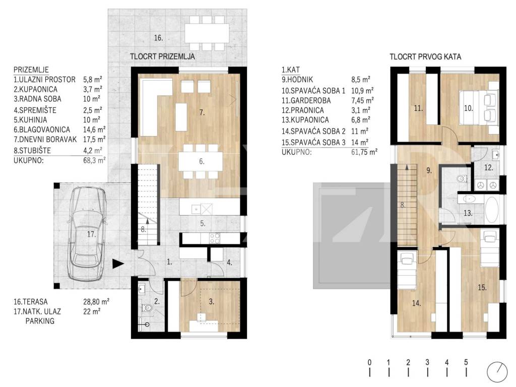 Prodaju se kuće u izgradnji u mirnoj ulicu u Gornjem Stupniku. Svaka kuća se sastoji od prizemlja u kojem će se nalaziti ulazni prostor, kupaonica, radna soba, spremište, kuhinja, blagavaonica, dnevni biravak i stubište, ukupne površine 68,3 m2.