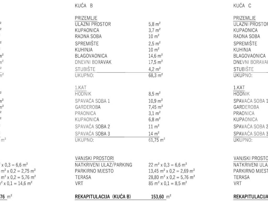 KUĆA B - natkriveni ulaz/ PM1 22 m2, PM2 14 m2, terasa 29 m2, vrt 85 m2 = 153,60 m2 x 2.000 eur/m2 = 307.200 eura