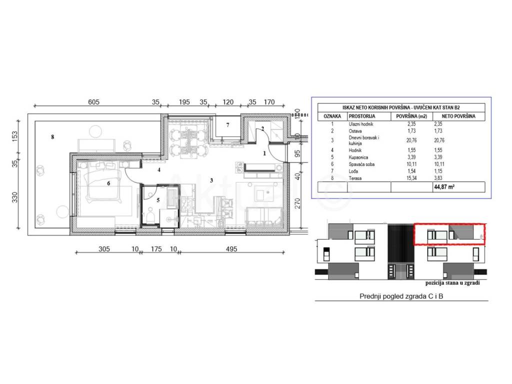 Stan B2 nalazi se zadnjem (drugom) katu zgrade B, ima neto ukupnu površinu 44.87 m2 te se sastoji od ulaznog prostora/hodnika, kuhinje i dnevnog boravka, spavaće sobe, ostave i kupaonice. Stanu pripada lođa površine 1.54 m2 i terasa površine 15.34 m2 koji je uključen u obračunu neto kvadrata.