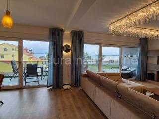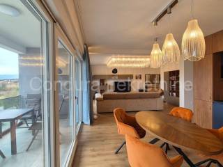 The exceptionally large living room with dining room and kitchen of 45.70 m2 has access through large glass walls to two covered loggias with a view of the sea, each of 9.90 m2.