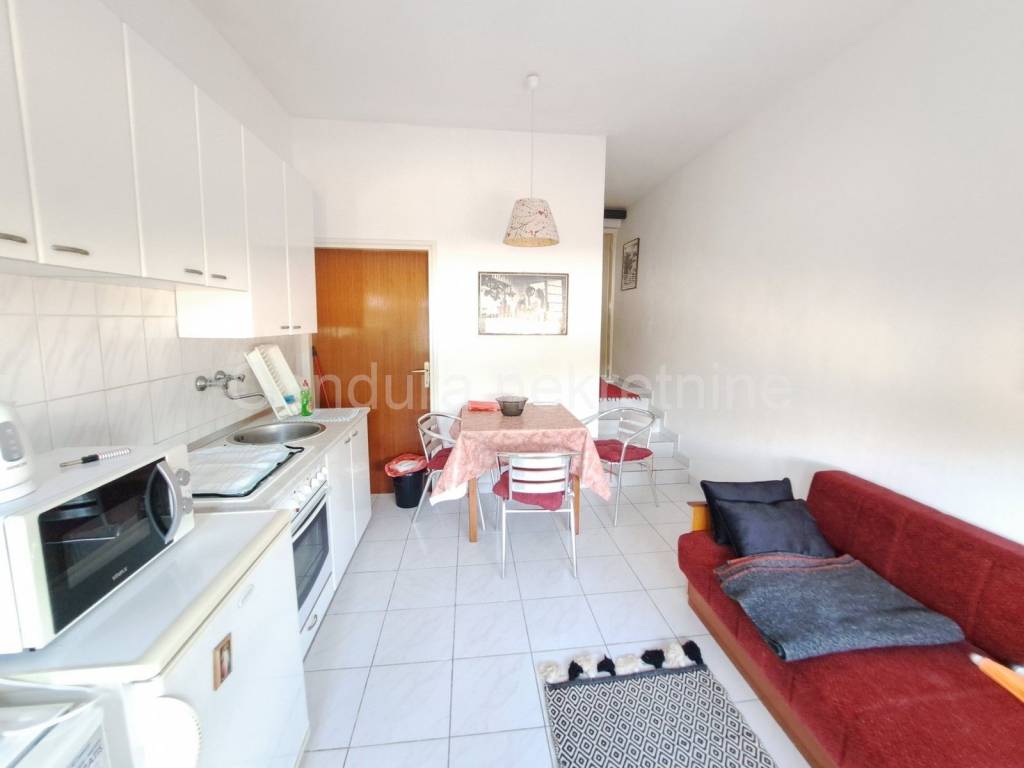 - one-bedroom apartment: living room with kitchen and dining room, bedroom, bathroom. It has an exit to a paved terrace where there is a grill.
