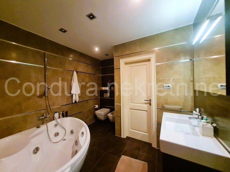 The apartment has an area of 104.32 m2 and consists of an entrance hall with a small wardrobe, a bedroom with a wardrobe, a bathroom, a room with a private bathroom, a living room and a dining room and a kitchen that are separated by a glass sliding door from the living room.