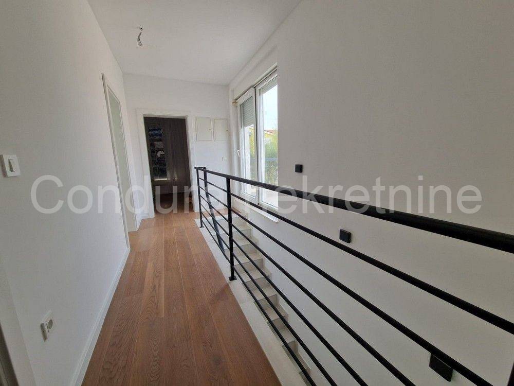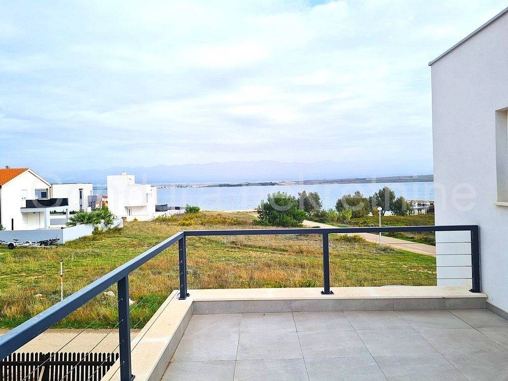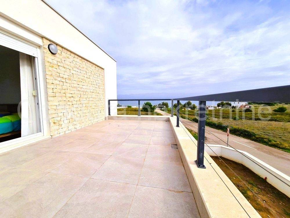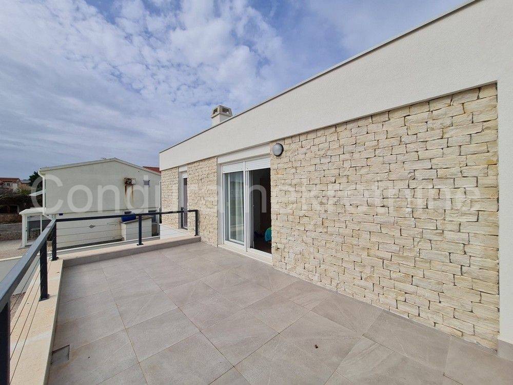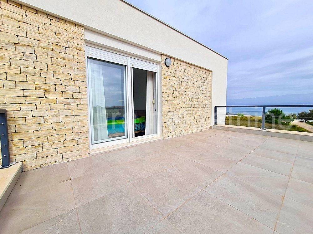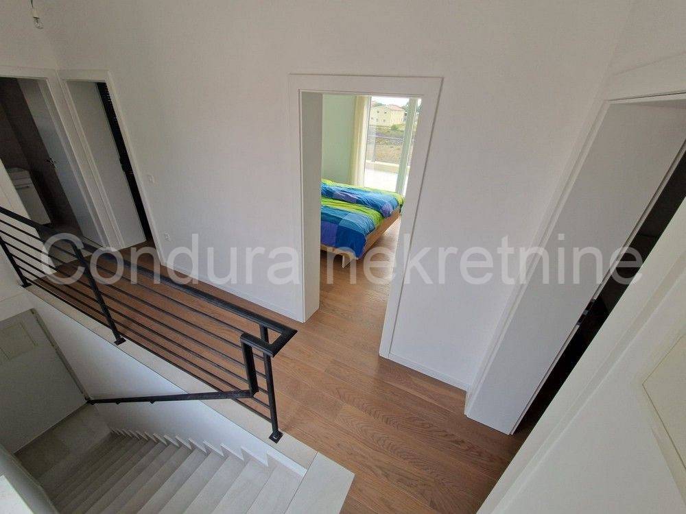 The layout of the rooms on the ground floor consists of an entrance, a toilet, a spacious living room with a kitchen and dining room, a garage and two partially covered terraces. The internal staircase leads to the upper floor, where there is a hallway, an uncovered terrace with a view of the sea, two bedrooms, a bathroom and a master bedroom with its own bathroom and access to a spacious uncovered terrace with an open view of the sea and Velebit.