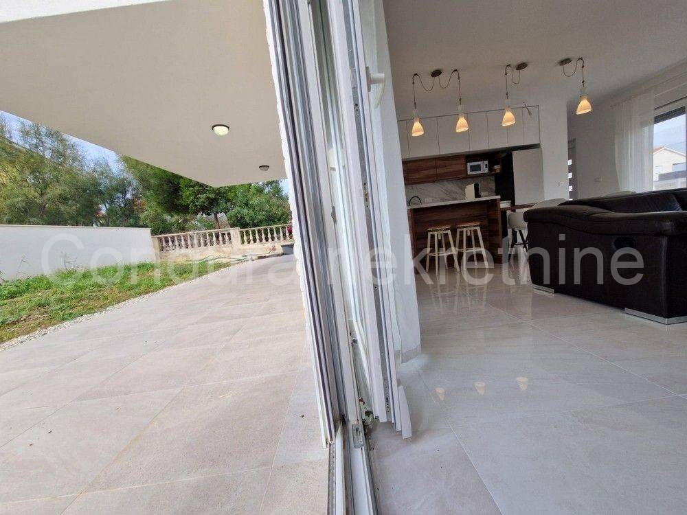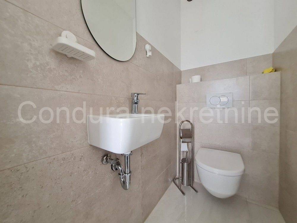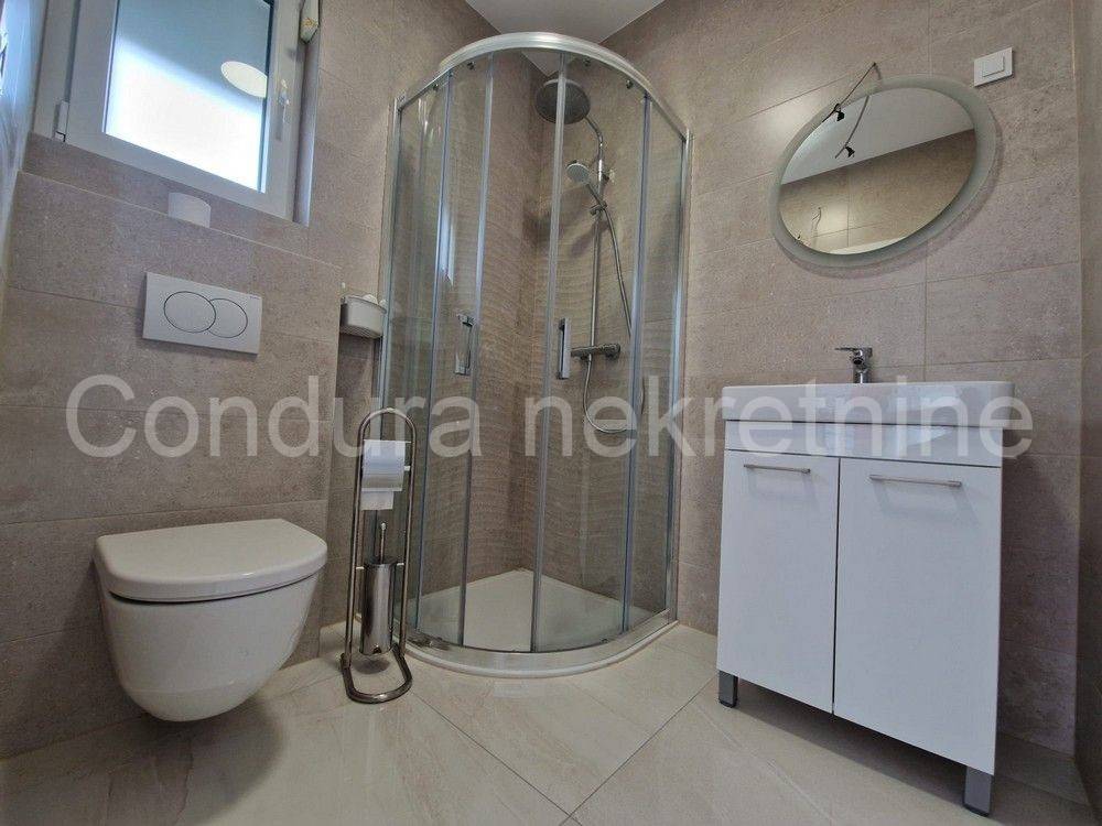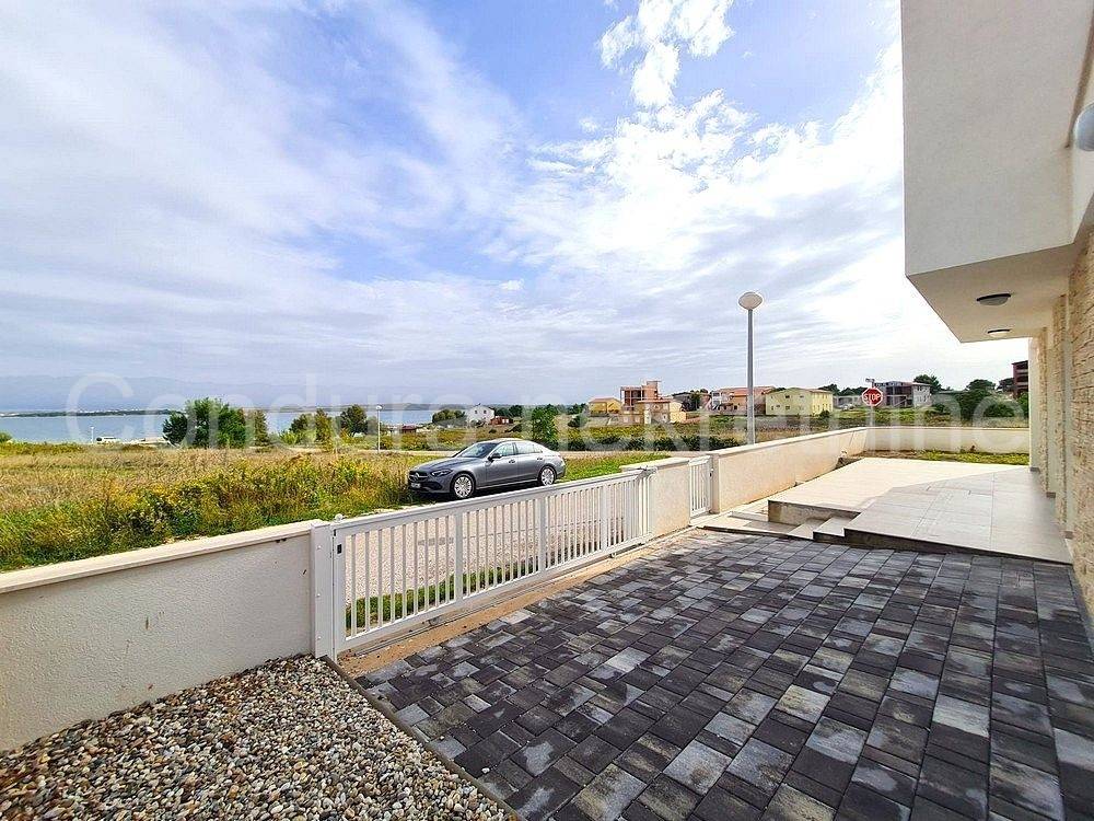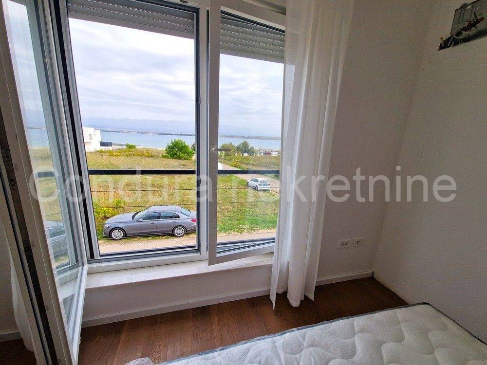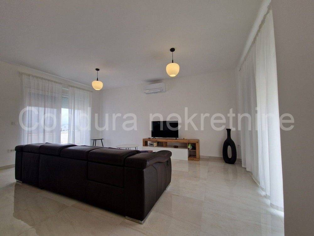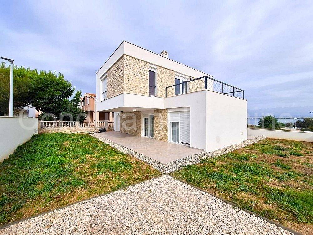 The layout of the rooms on the ground floor consists of an entrance, a toilet, a spacious living room with a kitchen and dining room, a garage and two partially covered terraces. The internal staircase leads to the upper floor, where there is a hallway, an uncovered terrace with a view of the sea, two bedrooms, a bathroom and a master bedroom with its own bathroom and access to a spacious uncovered terrace with an open view of the sea and Velebit.