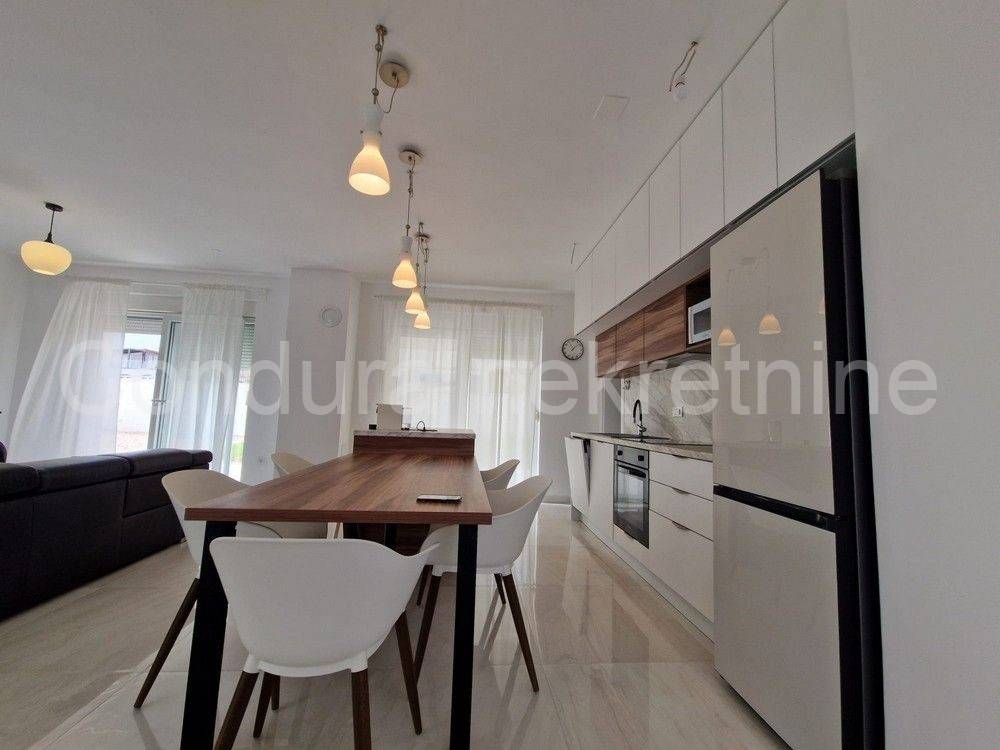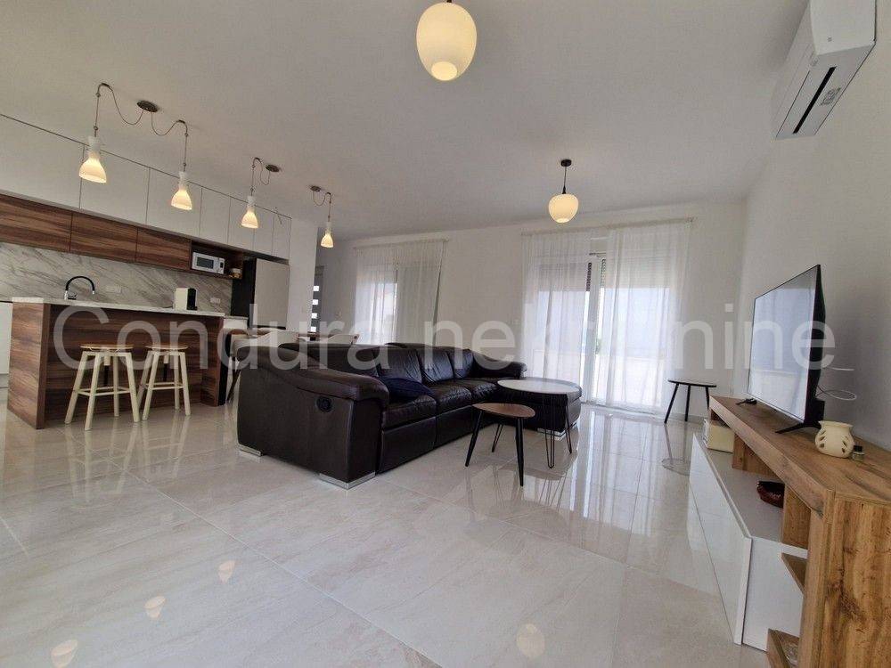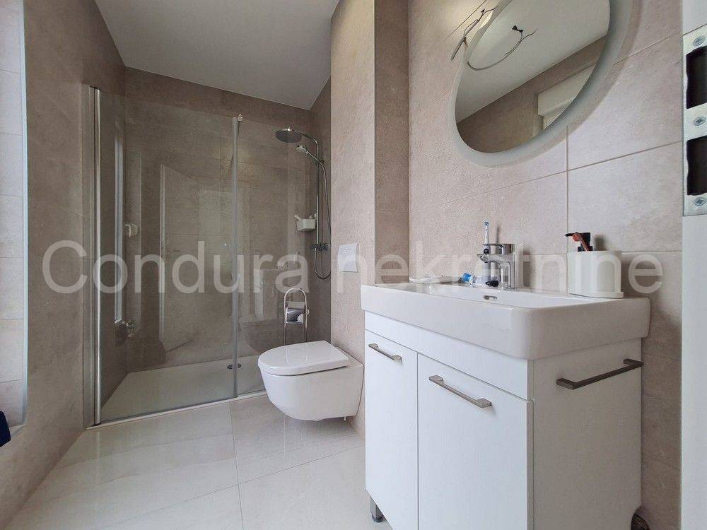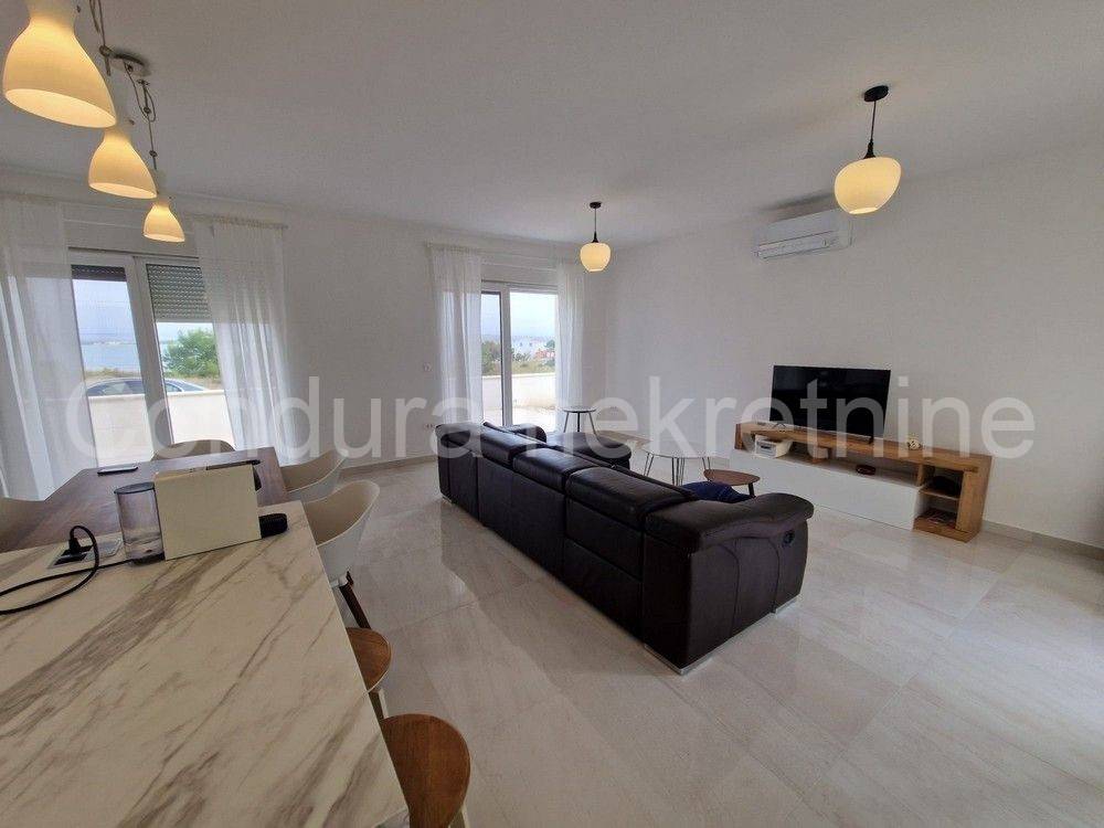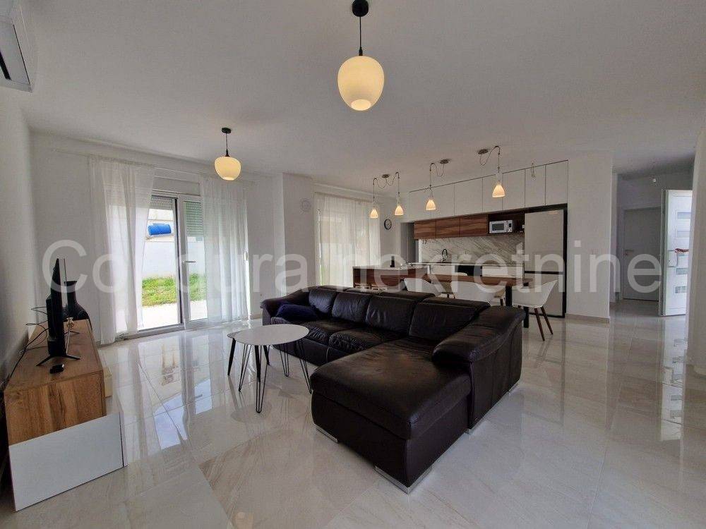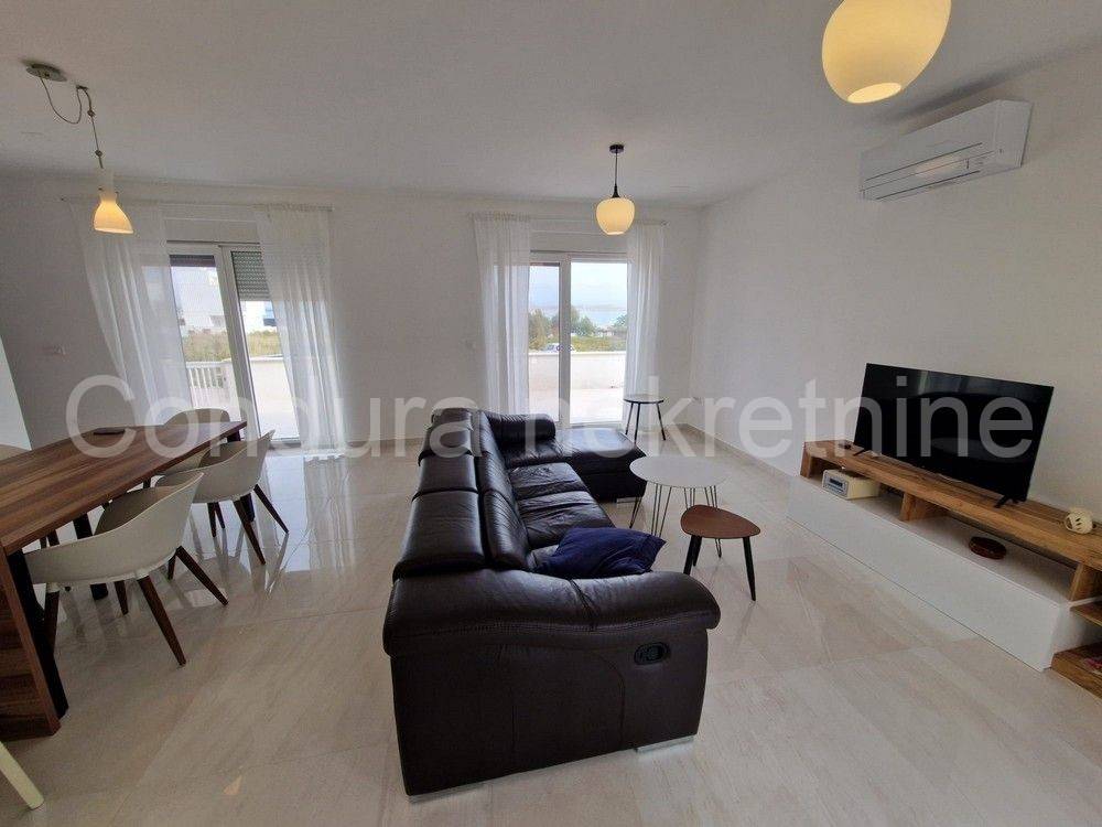 The layout of the rooms on the ground floor consists of an entrance, a toilet, a spacious living room with a kitchen and dining room, a garage and two partially covered terraces. The internal staircase leads to the upper floor, where there is a hallway, an uncovered terrace with a view of the sea, two bedrooms, a bathroom and a master bedroom with its own bathroom and access to a spacious uncovered terrace with an open view of the sea and Velebit.