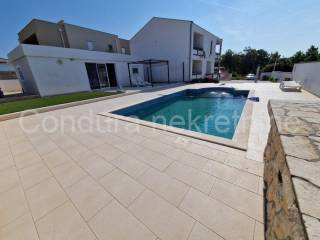The house is located on a spacious plot, a large garden with a swimming pool and an auxiliary building that is used as a space for laundry, a toilet and an area with a kitchen and a large dining room with an outdoor terrace.