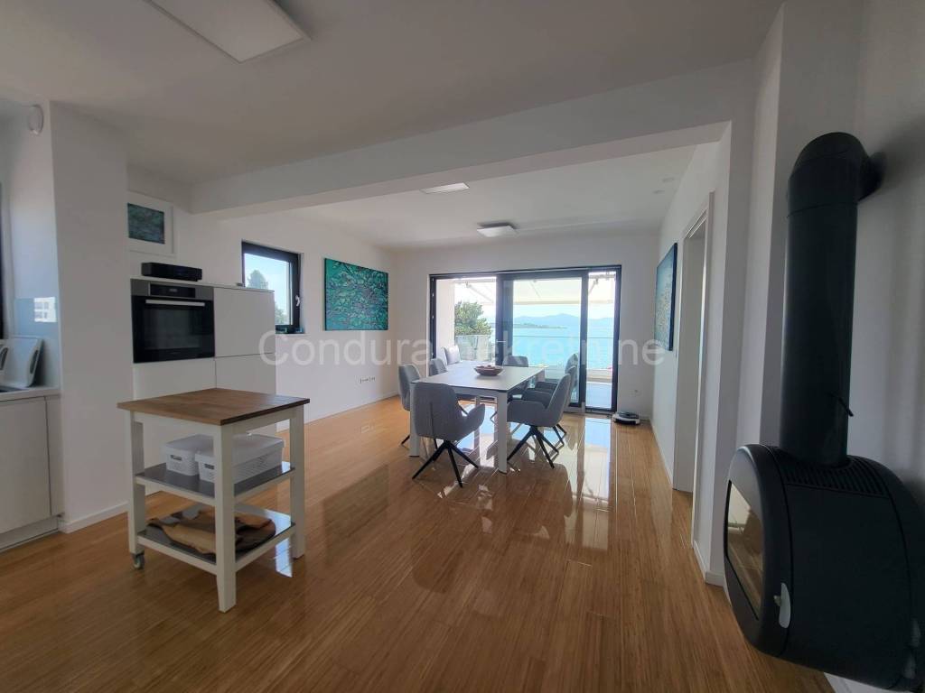 Glass walls from the dining room open to a spacious, mostly covered terrace with a view of the sea and islands, which is equipped with furniture for sitting and relaxing and a practical outdoor grill. The smaller, uncovered part of the terrace is an ideal place to enjoy the sun, while the awning, if necessary, offers protection from the sun in that part as well.