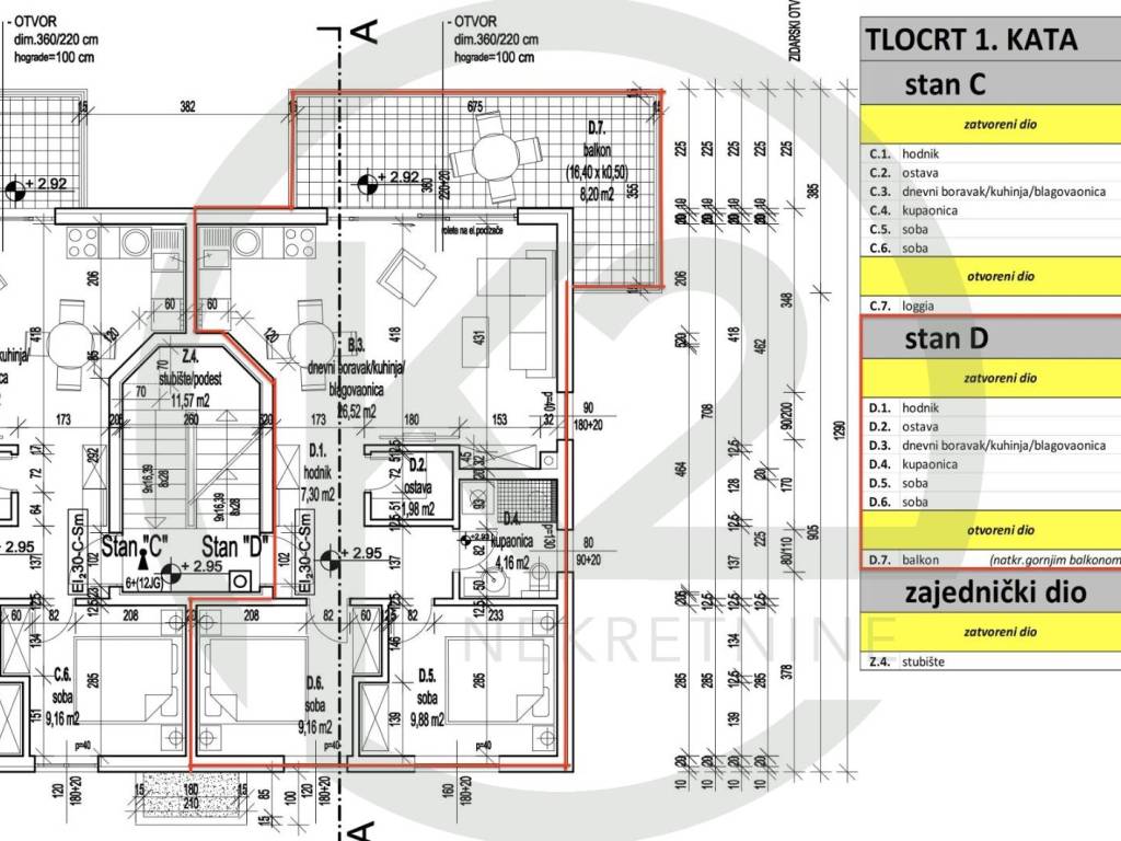 Predmetni stan oznake D nalazi seu prizemlju zgrade te se sastoji od ulaznog prostora, kupaonice sa WC-om, dnevnog boravka sa kuhinjom i blagovaonicom, dvije spavaće sobe terase i ostave.