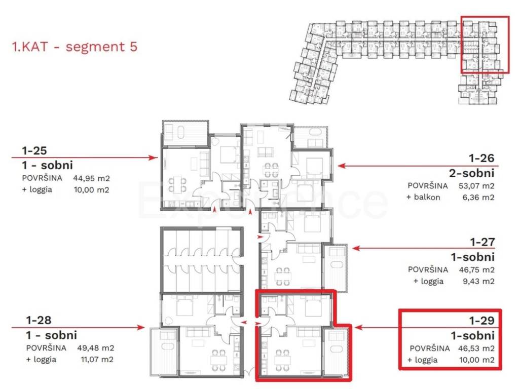 On sale is an apartment situated on the first floor of the building, surface of 54 m. Contains: entrance hall, an open and bright space in which there is a living room, dining room and kitchen with access to the loggia (10 m), bedroom and bathroom. The apartment also has a storage (3,88 m) and an outdoor covered parking space.