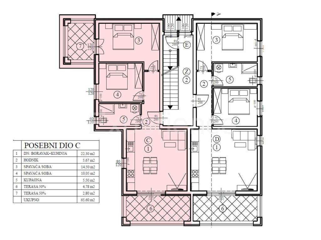 Nearby Poreč - cca. 9 km from the sea and the city, in a quiet environment there is an apartment in construction, surface of 65,60 m. The apartment is situated on the first floor of an intimate residential building with only 5 residential units. Contains: entrance hall, living room, kitchen and dining room with access to a spacious covered terrace (9,56 m), two bedrooms, one of which has access to a covered terrace (5,60 m) and a bathroom.