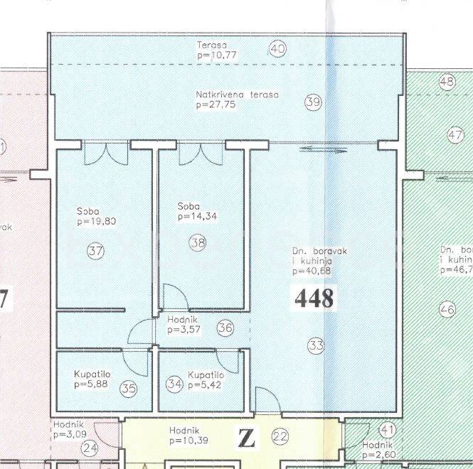 Crveni vrh, in an exclusive location, just 130 m from the beach is a comfortable apartment for sale, with the total area of 137.99 m. The apartment is situated within the resort in a position that offers a beautiful view of the sea. The building was built in 2005. and regularly maintained. The apartment is situated on the ground floor of the building. It includes: entrance hall, an open and bright space where are situated a living room, kitchen and dining room with access to a spacious covered terrace (38.52 m) with a beautiful sea view, two bedrooms and two bathrooms. The apartment also has a storage room (9.78 m) in the basement of the building.