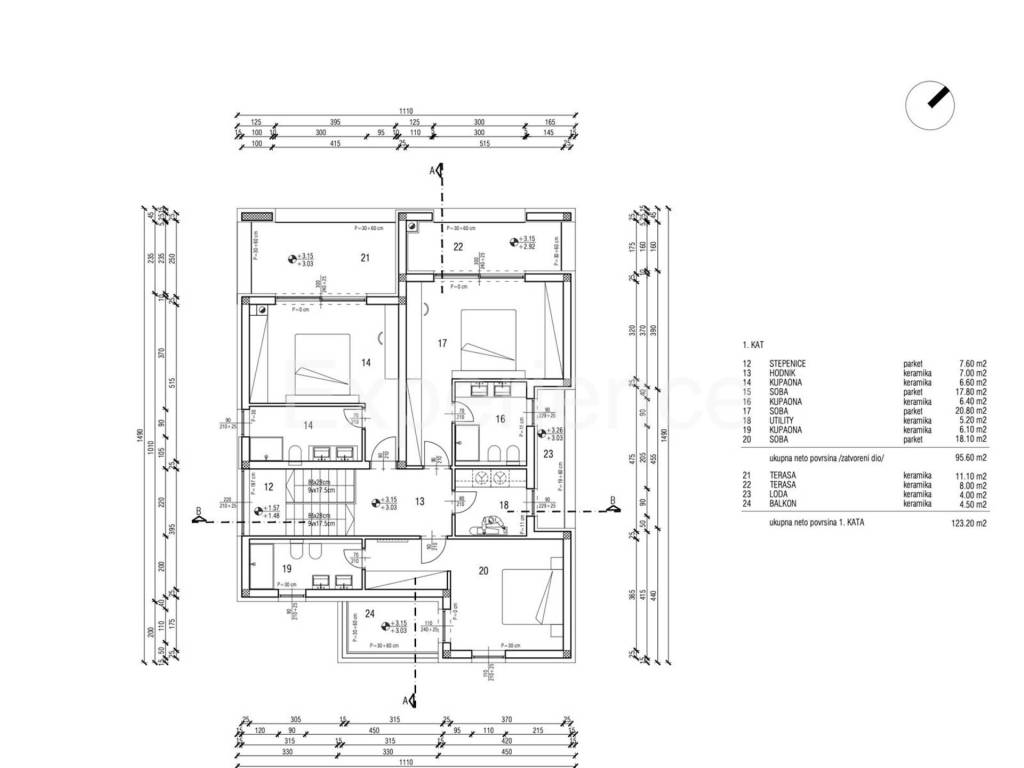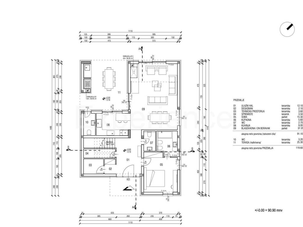The villa is spread over two floors. On the ground floor is situated: entrance hall, living room and dining room with access to a spacious covered terrace (25.30 m), kitchen, bedroom with its own bathroom, technical room, storage room and two toilets. While on the first floor is situated laundry and three bedrooms, each with its own bathroom and access to the terrace. The terrace offers a view of the sea.