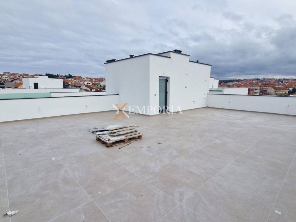 A new apartment is for sale in Zadar, located in the Crvene kuće area. The apartment is situated on the second floor of a modern residential building, which is expected to be ready for occupancy by the beginning of 2026. The building has a lift. Nearby, there will be a park with trees, walking paths, and a children"s playground.The layout of the apartment includes an entrance hall, two bedrooms, a bedroom with a bathroom, a bathroom, a toilet, a kitchen with a dining area and living room, and a loggia (105,50 m2 net). From the staircase, there is access to a roof terrace with an area of 120,18 m2. The net usable area of the described rooms is 135,54 m2.Additionally, the apartment comes with three outdoor parking spaces. The total net area, including the parking, is 143,79 m2.The property is located 1,3 km from the sea and 2,7 km from the city center.The apartment is sold fully furnished.