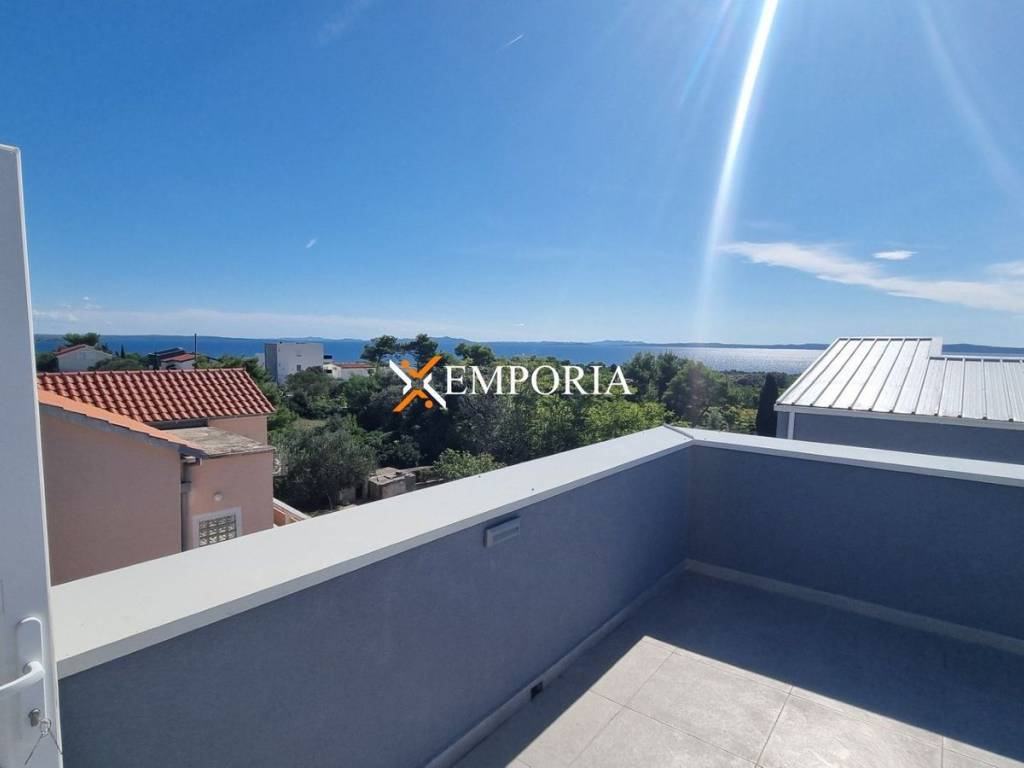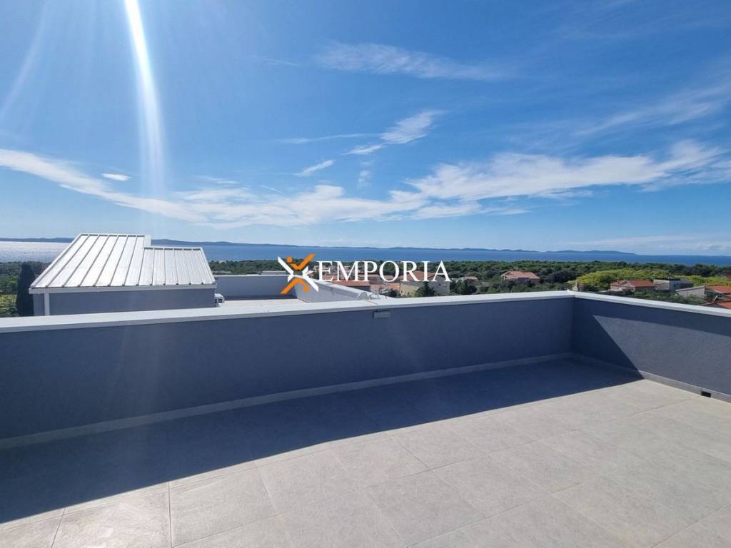 A house with a pool on the island of Vir is for sale. It is a modern new building.The house consists of a ground floor and first floor. The layout of the rooms on the ground floor includes a covered entrance, hallway, kitchen with dining area, living room, and a toilet. Internal stairs lead to the first floor, where there is a hallway, three bedrooms, each with its own bathroom. Internal stairs lead further to the rooftop terrace with an area of 66,02 m2.