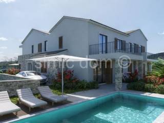 A family house with a swimming pool is for sale in the beautiful village of Jezera on Murter, close to a pebble beach. It is a charming terraced house designed in a beautiful Mediterranean stone style. House S3 consists of two floors with a total area of 126.78 m2, or a net usable area of 109.64 m2, including coefficients. The ground floor consists of a hallway, bathroom, bedroom, and an open living room with kitchen and dining room with access to a spacious terrace with a sundeck, an outdoor pool of 23.76 m2. On the first floor there are two bedrooms (one with a terrace), a bathroom and a storage room. The house is superbly equipped: carpentry with mosquito nets and shutters, high-quality ceramic tiles, underfloor heating. The yard is completely fenced, and there is also a parking space for cars. The house is located in a beautiful quiet street only 680m from the pebble beach and 550m from the city center. The house will be ready for occupancy by summer 2026.