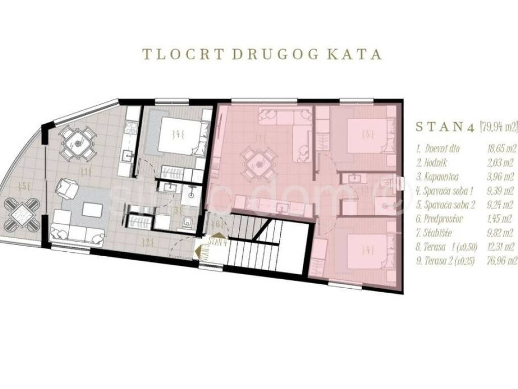 We are mediating the sale of a very high-quality and spacious apartment in a quiet location in Podstrana. The apartment has a total area of 79.94m2 and is placed on the second floor of a small building with only 5 units, thus guaranteeing peace and privacy. The apartment consists of two bedrooms, a bathroom, a large living room with a kitchen and a dining room, and the apartment also has an impressive roof terrace with an incredible view of the sea, islands and the entire surrounding area. Construction will begin in early spring 2026 and is expected to be completed in early summer 2027. The construction itself is excellently planned and the building will be of top quality: tested air conditioning, insulation, first-class bathroom equipment... We would like to emphasize that the price of the apartment also includes a garage parking space and a small storage room, and since the investor is a legal entity, there is no obligation to pay 3% real estate tax. Ownership is in order.