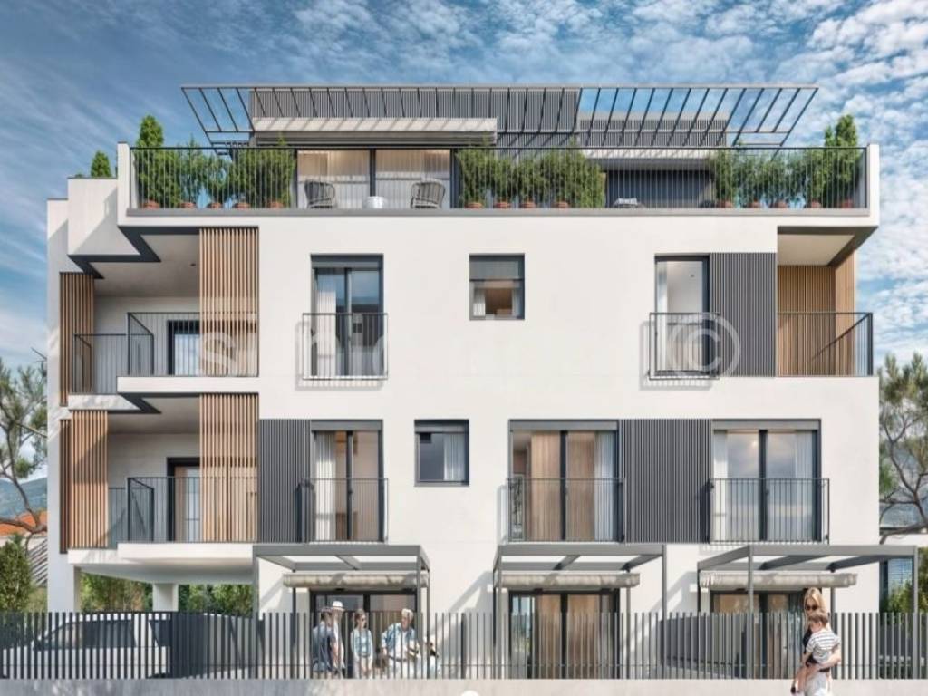 Apartments for sale in an extremely attractive location close to all amenities in Kastel Kambelovac. The building is less than a two-minute walk from the beach and close to all other necessary amenities such as shops, cafes, schools and kindergartens. The building is being built by a reputable company with extensive experience in new buildings, so buyers are exempt from real estate tax. Apartment S2 is placed on the ground floor of the building and has a net usable area of 74.82 m2 and is southwest-facing. It consists of a hallway, bathroom, three bedrooms and an open-concept kitchen with a dining room and living area that leads to a spacious paved terrace. The building also includes storage rooms and outdoor parking spaces for an additional fee. Each apartment is equipped with attention to detail and high construction standards. In terms of equipment, renowned manufacturers have been selected that guarantee durability, functionality and aesthetics: Daikin air conditioners, Hansgrohe and Geberit sanitary ware, underfloor heating in the bathrooms, and in agreement with the investor, it can be implemented throughout the entire apartment at this stage, Italian Premium ceramics, category I oak parquet, aluminium exterior joinery, etc. The expected move-in is spring 2027.