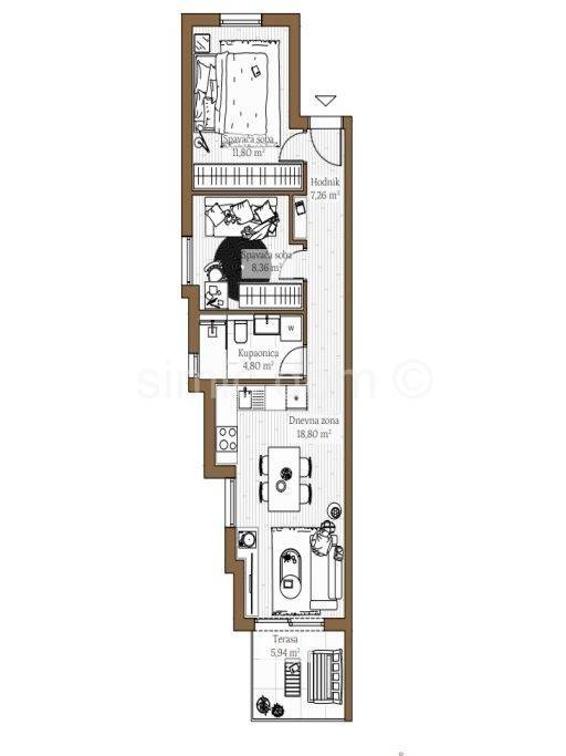Apartments for sale in an extremely attractive location close to all amenities in Kastel Kambelovac. The building is less than a two-minute walk from the beach and close to all other necessary amenities such as shops, cafes, schools and kindergartens. The building is being built by a reputable company with extensive experience in new buildings, so buyers are exempt from real estate tax. Apartment S2 is placed on the first floor of a smaller building and has a net usable area of 53.99 m2 and is southwest-facing. It consists of a hallway, bathroom, two bedrooms and an open-concept kitchen with a dining room and living area that leads to a terrace. The building also includes storage rooms and outdoor parking spaces, which are available for an additional fee. Each apartment is equipped with attention to detail and high construction standards. In terms of equipment, renowned manufacturers have been selected that guarantee durability, functionality and aesthetics: Daikin air conditioners, Hansgrohe and Geberit sanitary ware, underfloor heating in the bathrooms, and in agreement with the investor, it can be implemented throughout the entire apartment at this stage, Italian Premium ceramics, category I oak parquet, aluminium exterior joinery, etc. The expected move-in is spring 2027.