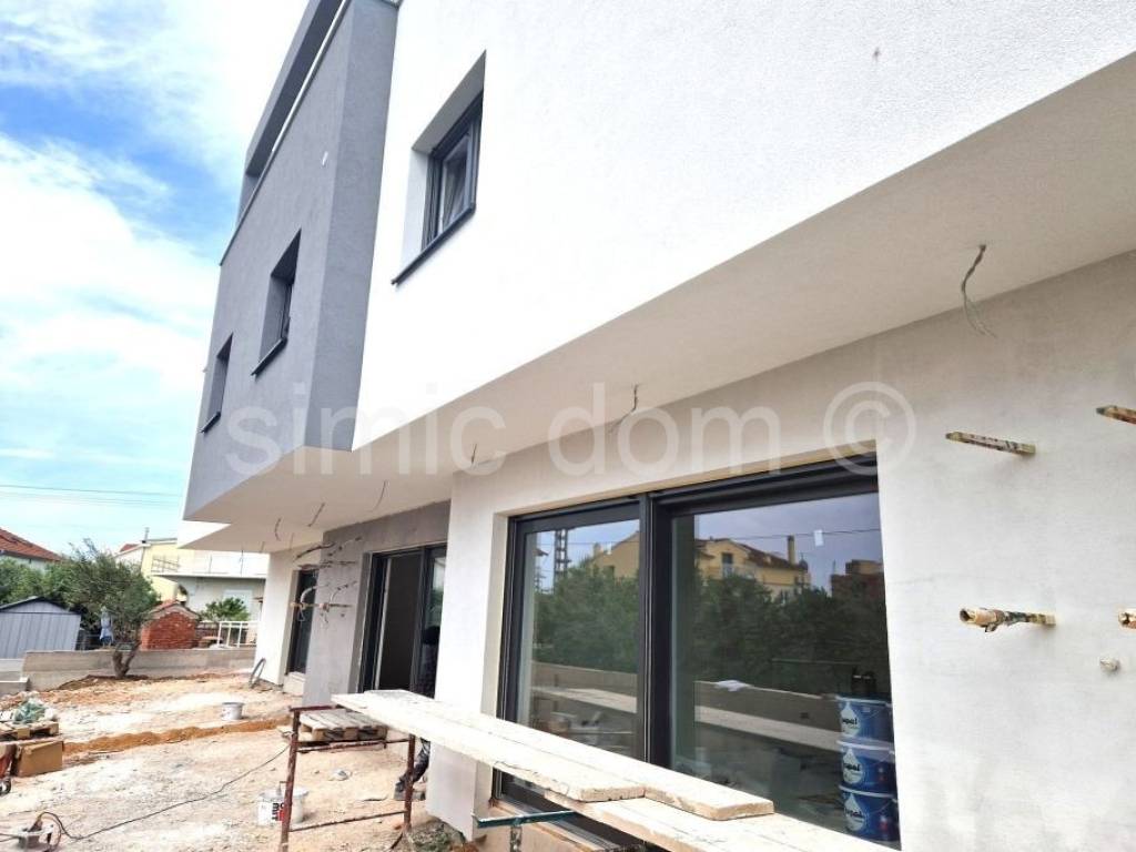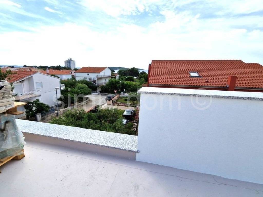 A terraced house for sale in a new building located just 200m from the beautiful pebble beach in Vodice. The house has a total area of 332 m2, or 171 m2 of net usable area, of which 113.58 m2 is interior space. It extends over three floors. The ground floor has an entrance area, a bathroom and an open-concept kitchen with a dining room and living room, which leads to a garden of a total of 37 m2 of floor space, and within which there is a paved area with two parking spaces. An internal staircase leads to the first floor, where there are three bedrooms and another bathroom. On the third floor there is a large roof terrace of 153 m2 with a beautiful view of the sea and the surrounding islands. The terrace also has an additional toilet, storage room, large sundeck and space for a jacuzzi. This modern design property will be equipped according to the latest construction standards. Among the equipment, we highlight: 8 cm polystyrene facade, anthracite-coloured PVC windows and doors with built-in mosquito nets and roller shutters with an electric motor, quality ceramic tiles, quality laminate flooring in the rooms, Grohe bathroom fixtures, air conditioners with Wi-Fi control, underfloor heating in the bathrooms and living room, glass railings on the terraces, preparation for a jacuzzi in the garden... The planned completion date of construction is August 15, 2025. The prime location of this property will guarantee the owners a wonderful vacation near the beach and all other amenities of the town of Vodice, but also an excellent investment.
