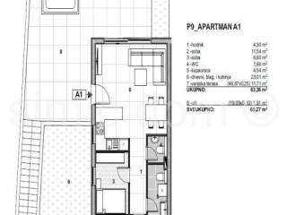 A two-bedroom apartment is for sale in a modern complex of buildings, just 150m from the beach on Ciovo. The entire complex offers a beautiful view of the sea. Apartment A1 is placed on the ground floor and has a net usable area of 65.27 m2, or a gross area of 117.61 m2. It consists of a hallway, two bedrooms, toilet, bathroom, living room, dining room, kitchen, spacious terrace and garden. The apartment has one outdoor parking space with the option to purchase an additional parking space. The construction and equipment inside the apartment are of an extremely high-quality standard, and the investor also offers a service of furnishing the apartment and interior decoration according to the highest standards, with a modern design that meets the needs of buyers, as well as a service of managing the rental of the apartment. Investing with a guaranteed return is a key advantage of this project. The investor offers the possibility of renting the purchased apartments for tourist purposes, taking over the complete management and hospitality services. In this way, the owners are guaranteed a return on their investment without the need to engage in operational work, because everything is done on their behalf, which enables them to have a secure income from tourist rentals. This project is one of the first of its kind in the area, and similar concepts are successfully applied around the world, and this settlement represents a unique investment opportunity in an attractive location with great potential for generating income from tourist rentals and long-term real estate value.
