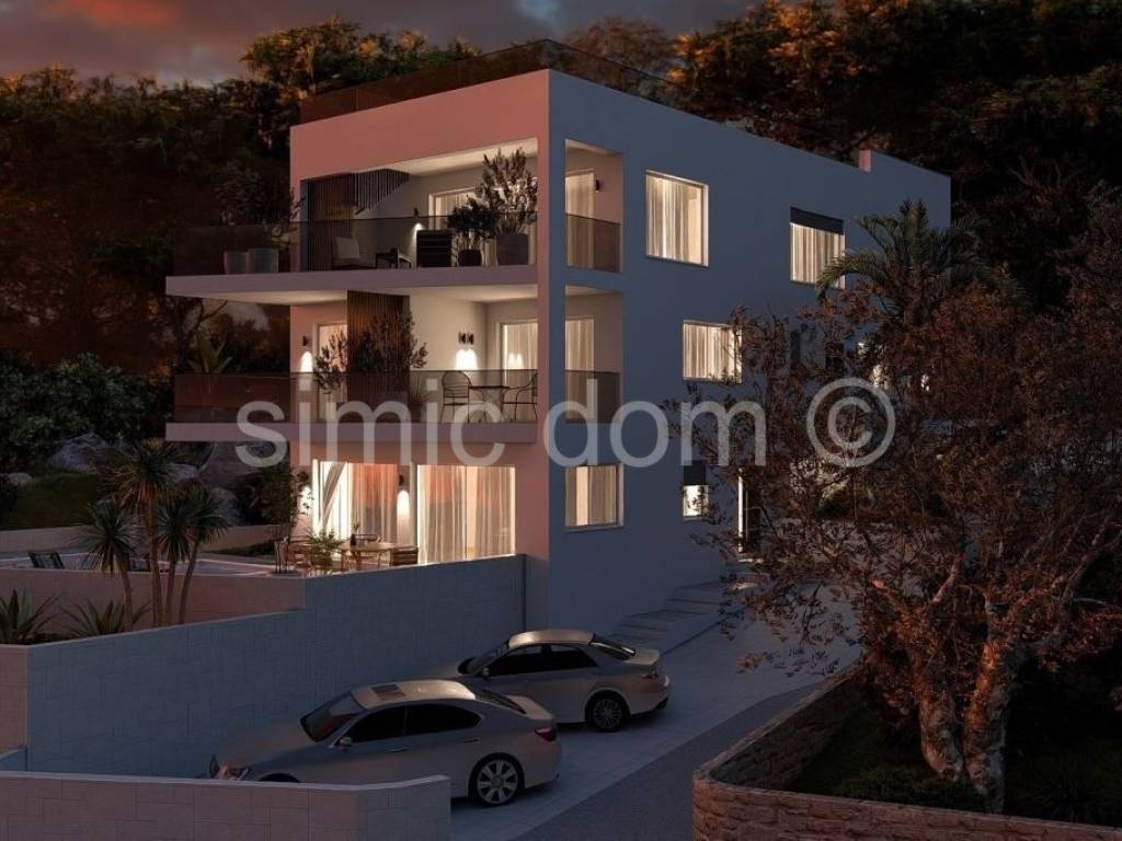 Modern penthouse apartment in a new building in the first row on Ciovo, from an investor who builds extremely high-quality real estate with excellent and modern design is for sale. The building is located in the most attractive area and in a quiet location right next to the turquoise blue sea and a beautiful beach. The penthouse apartment is placed on the second floor of a smaller building and has an internal area of 104 m2 and 3 more terraces, 2 at the apartment level and a large roof terrace. The terraces together have 154 m2 of floor space. With the coefficients included, the apartment has a net usable area of 147 m2. It consists of a hallway, 3 bedrooms - each with its own bathroom, and 1 with its own dressing room, a guest toilet, a laundry room, and a kitchen with a dining room and a living room from which you can exit to a terrace with a beautiful view of the sea and the Dalmatian islands. The penthouse has a complete roof terrace of 123.45 m with a view of the Dalmatian islands, which is ideal for a summer kitchen, hot tub, lounge and other facilities. It also has 2 outdoor parking spaces. Each apartment will have a separate entrance to the building, which provides privacy. All apartments will be superbly equipped, underfloor heating will be carried out throughout the apartment, all rooms are air-conditioned, aluminium windows, top-quality ceramics and sanitary ware, and the building will also have video surveillance. The building's courtyard will include arranged parking spaces and beautiful Mediterranean vegetation. This is a top-quality property whose value will always be at a high level and which the owners will certainly enjoy. All facilities are nearby, and the airport is only 10 km away.