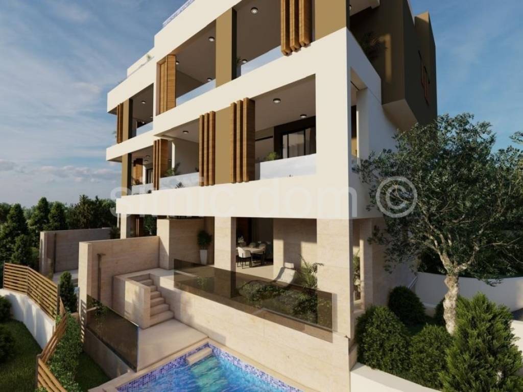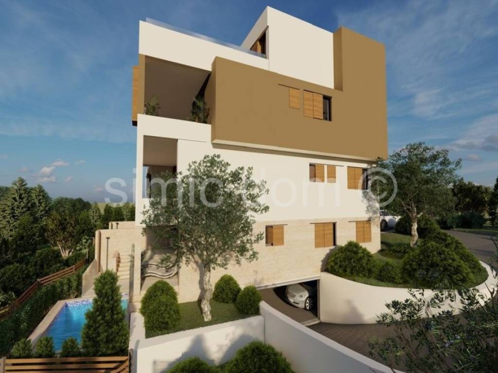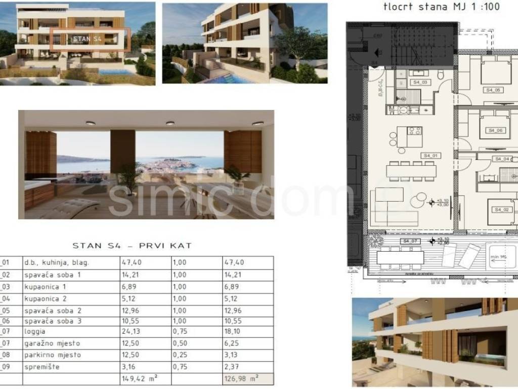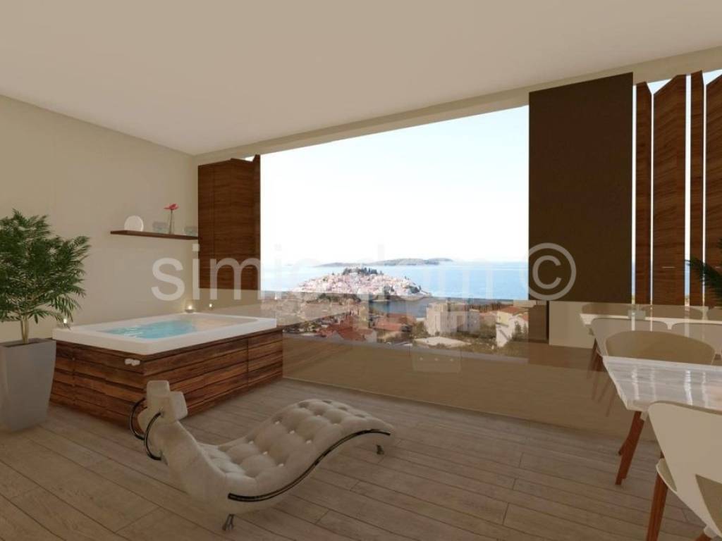 We are mediating the sale of apartments located in a smaller building, which is an ideal combination of modern architecture and traditional materials and excellent design. The new building is located only 450m from the center of Primosten and the sea and is placed in a quiet street. Each apartment will have an excellent view of the sea and the beautiful surroundings. Apartment S4 is placed on the elevated ground floor and together with all the accessories has a net usable area of 127m2. The apartment itself has an internal area of 97m2 and a spacious loggia of 24m2 of floor area. It consists of a hallway, 3 bedrooms, 2 bathrooms, an open-concept living area with a kitchen and dining room, a loggia with a jacuzzi, and it also has 2 parking spaces, one of which is a garage space, and a storage room. The highest quality materials and equipment will be used in the construction and furnishing. The building will have an elevator, all apartments will have top-quality aluminum joinery with electric roller shutters, as well as underfloor heating with a heat pump, the ceilings will be lowered with built-in ceiling air conditioners, and glass railings will be installed on the terraces, top-quality ceramics and parquet, as well as sanitary ware in the bathrooms. Due to carefully planned details, a top location and modern design, this property can provide potential buyers with a comfortable and peaceful home, as well as a top investment in the extremely attractive tourist town of Primosten.