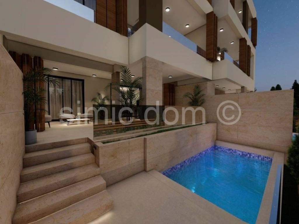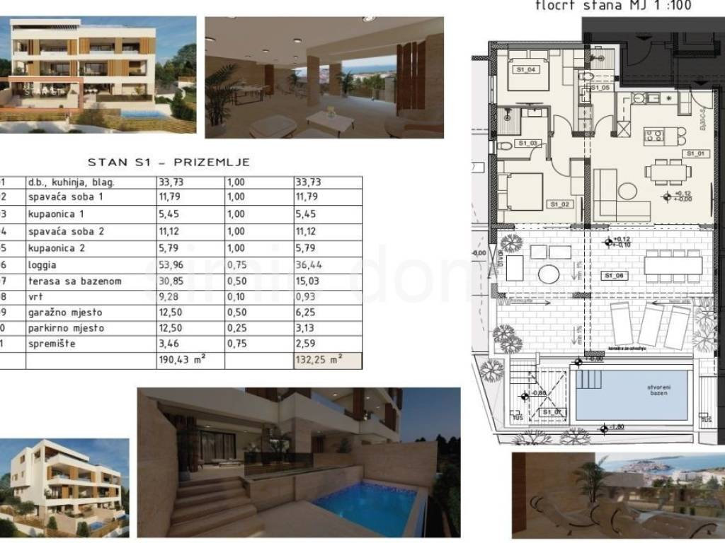 Apartments for sale are located in a smaller building with excellent design, an ideal combination of modern architecture and traditional materials. The building is located in a quiet street, and it is only 450m from the sea and the center of Primosten. Every apartment in the building will have an excellent view of the beautiful surroundings and the sea. Apartment S1 is placed on the raised ground floor and, together with all accessories, has a net useful area of 132m2. The interior area of the apartment itself is 68m2, and it also has a spacious loggia with a floor area of 54m2. It consists of 2 bedrooms, 2 bathrooms, an open-concept living area with a kitchen and dining room, a loggia, and a garden with a paved terrace by the pool, 2 parking spaces, one of which is a garage, and a storage room. The highest quality materials and equipment will be used in the construction and furnishing. There will be an elevator in the building, and all apartments will be equipped with high-quality aluminum carpentry with electric roller blinds and underfloor heating with a heat pump. The ceilings will be lowered with built-in ceiling air conditioners, and glass railings on the terraces, high-quality ceramics and parquet, as well as sanitary ware in the bathrooms will be installed. Due to the carefully planned details, superb location and modern design, this property can provide potential buyers with a comfortable and peaceful home, as well as a superb investment in the extremely attractive tourist destination of Primosten.
