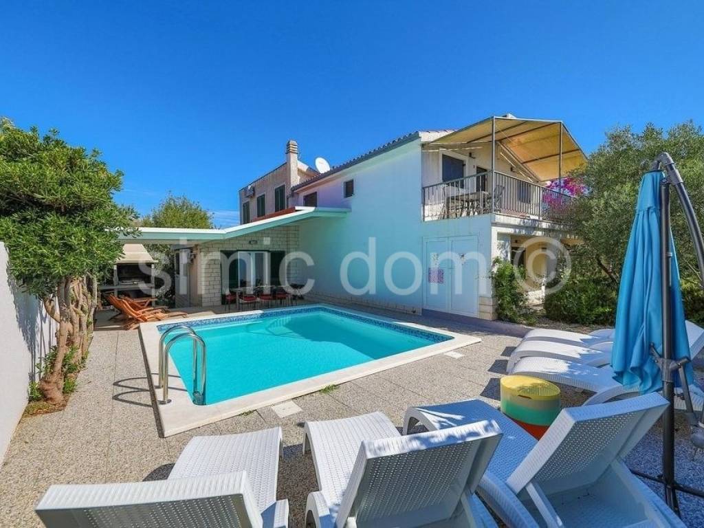 We mediate the sale of a very charming, well-maintained and spacious house in a quiet location on the island of Ciovo. The gross area of the house is 242m2, and it is located on a plot of 509m2. The house extends over three floors: basement, ground floor and first floor. In the basement there is a very large storage room and a water tank. The first part of the house is designed as one residential unit, which on the ground floor has a bedroom, a bathroom and a nice living room with a kitchen, and from that part there is access to a beautiful courtyard with a large swimming pool and sunbathing area. The first floor of this part of the house also offers two bedrooms with one bathroom. In the second part of the house, there are two apartments (one on the ground floor, the other on the first floor), and each of these apartments has two bedrooms, bathrooms and well-decorated living rooms with kitchens. This level of the house also offers a very charming view of the sea and the surrounding islands. The house is surrounded by a paved, carefully maintained garden, and an additional advantage is a beautiful garden with a lot of Mediterranean plants. The house is very well equipped and furnished, and given the number of options in terms of separate residential units, it is a very good choice for your vacation, but also for possible rental. Ownership in order.