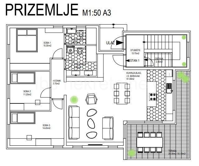 A three-room apartment of 120 m2 with a kitchen, dining room, living room and two bathrooms, is located on the second floor of the building.