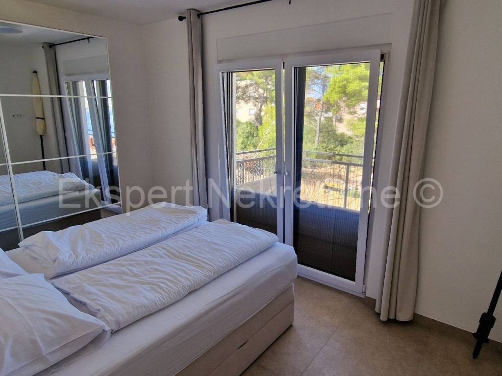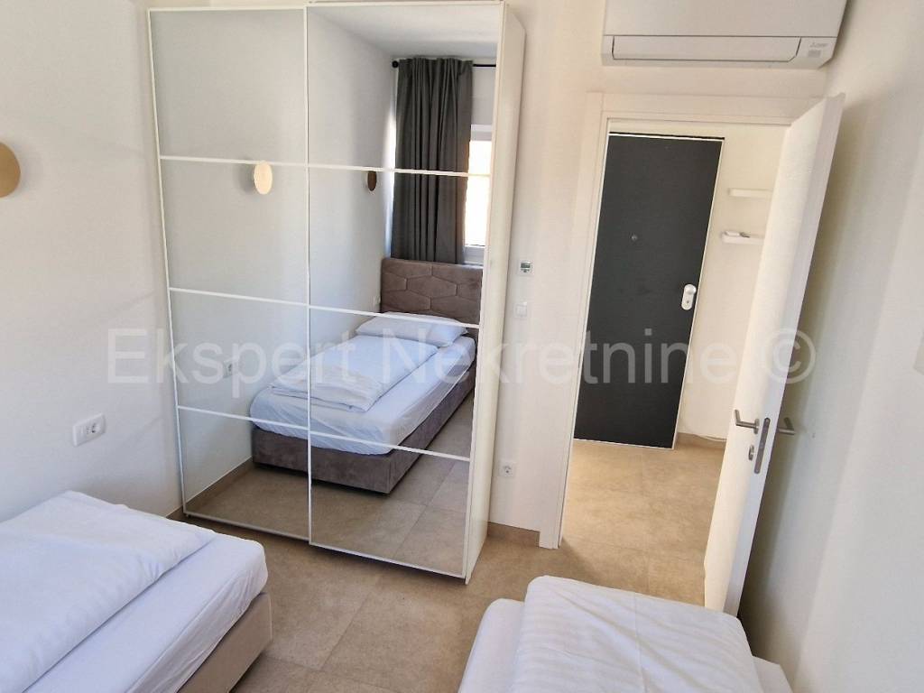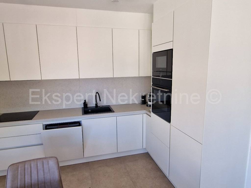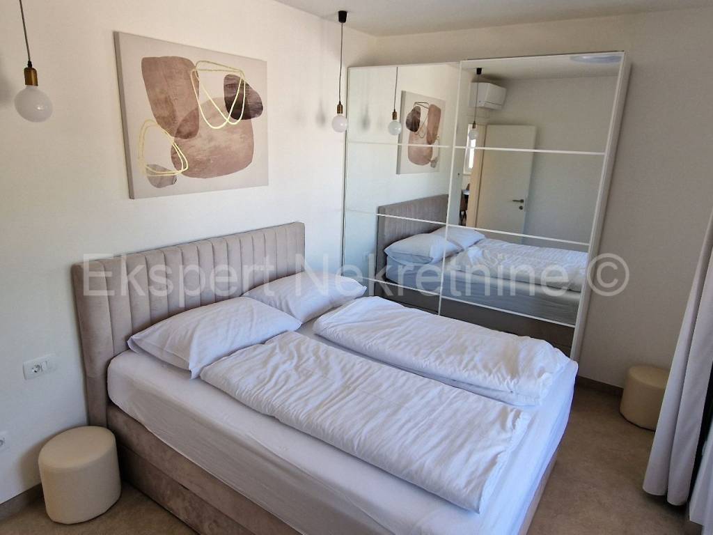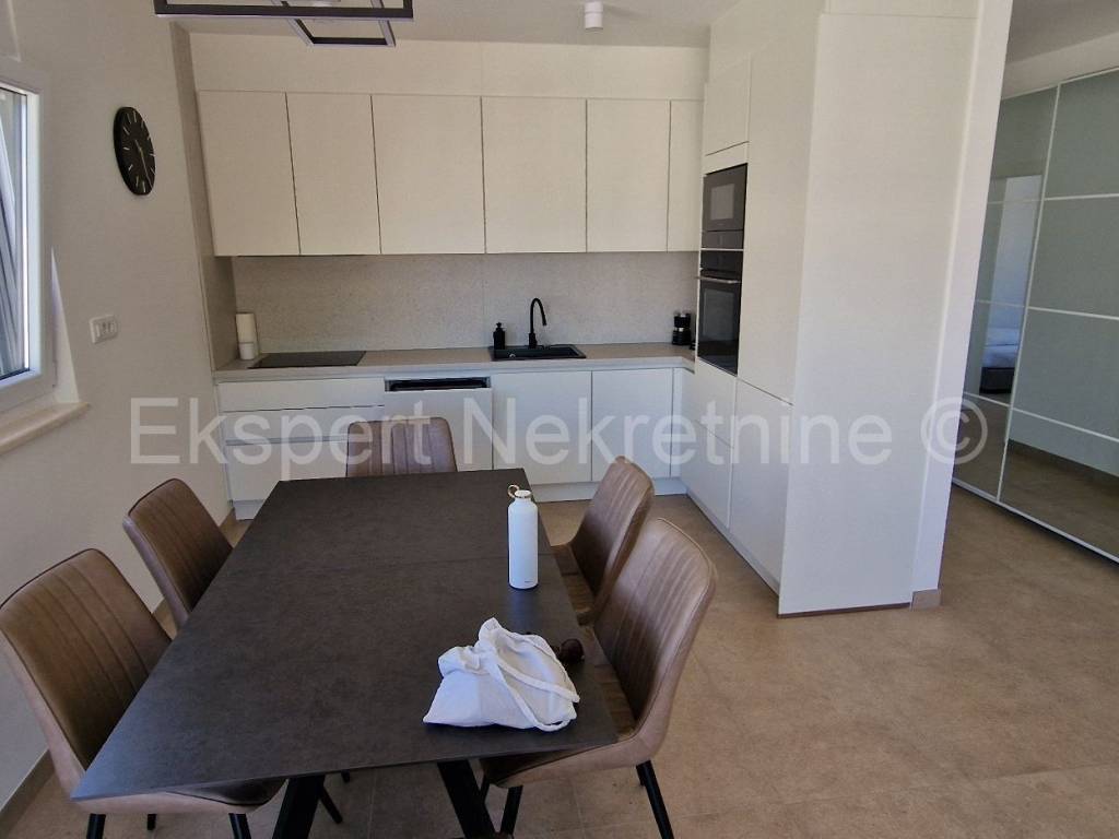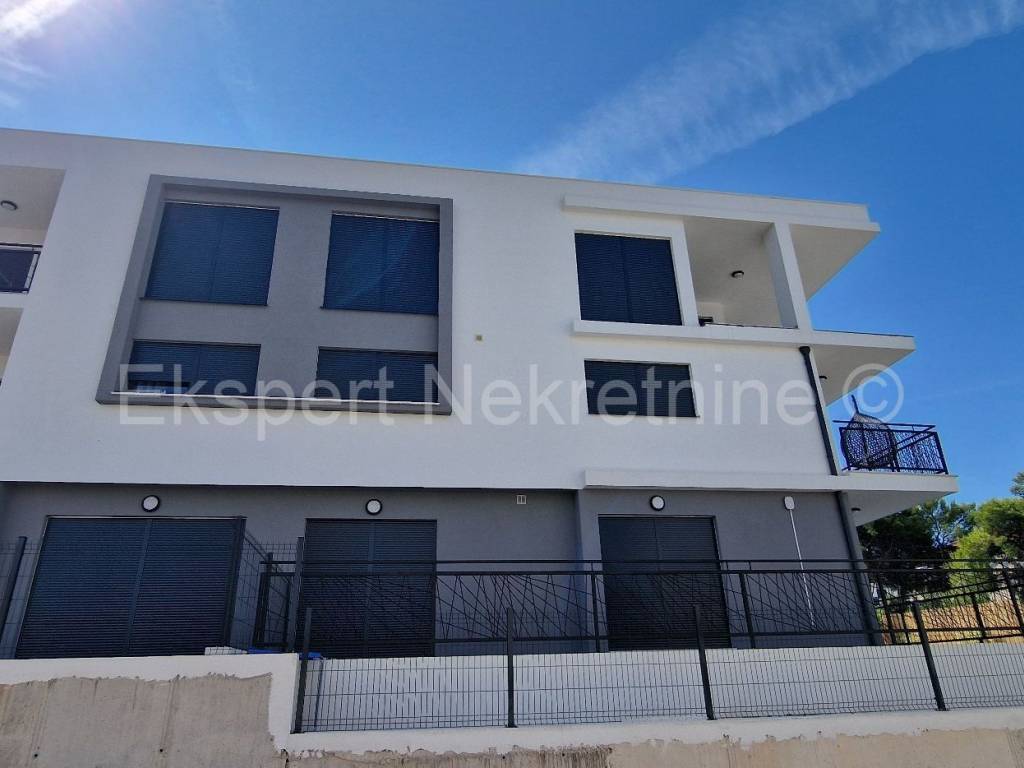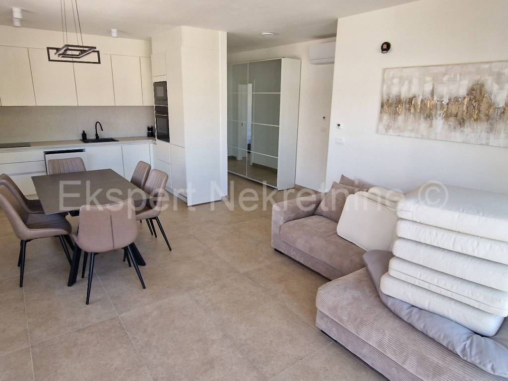 Čiovo, Okrug Gornji, comfortable two-bedroom apartment 75 m2 (58 m2 apartment + 17 m2 balcony), in a new building only 250 m away from the sea and the beach. The apartment is located on the first floor of the building and is oriented north-south-west and consists of two bedrooms, bathroom, kitchen with dining room and living room, and a large balcony of 17 m2. The apartment also has one outdoor parking space. The apartment is located in a new building that is in the final stages of construction and will soon be ready to move in. The apartment is fully furnished with new and modern furniture that is included in the price. Quality construction and equipment of the apartment (quality ceramics, underfloor heating throughout the apartment, electric shutters, air conditioning in all rooms, large glass wall in the living room, etc.). Excellent and quiet location, close to the sea and the beach.For more info, contact the agency.
