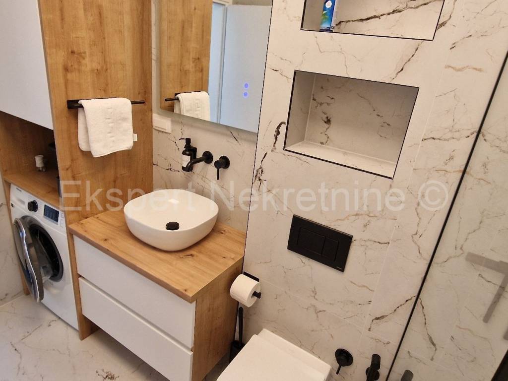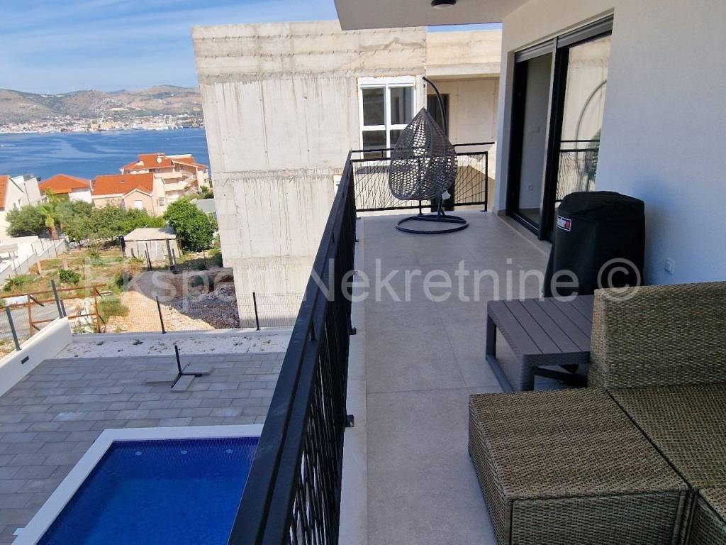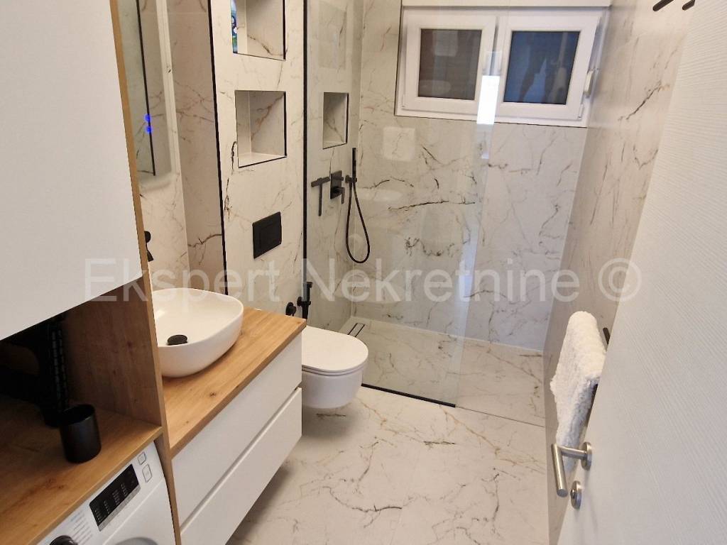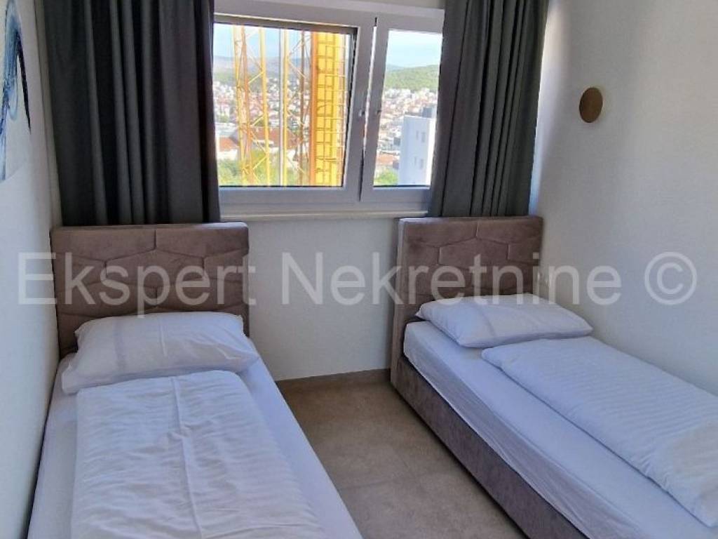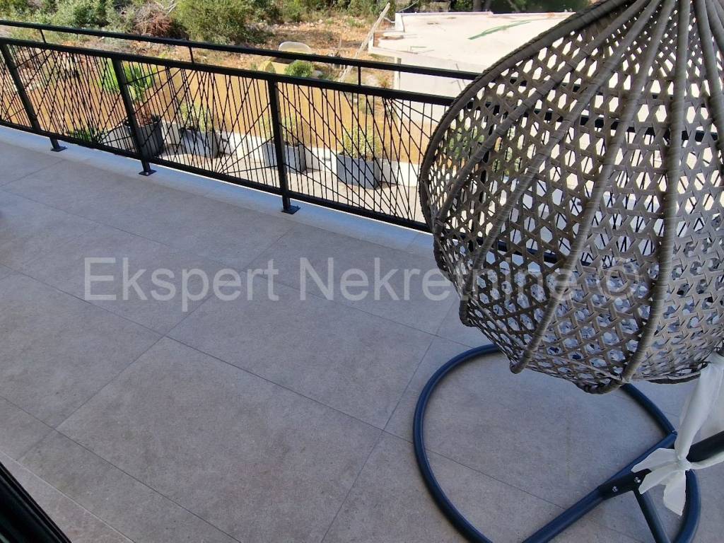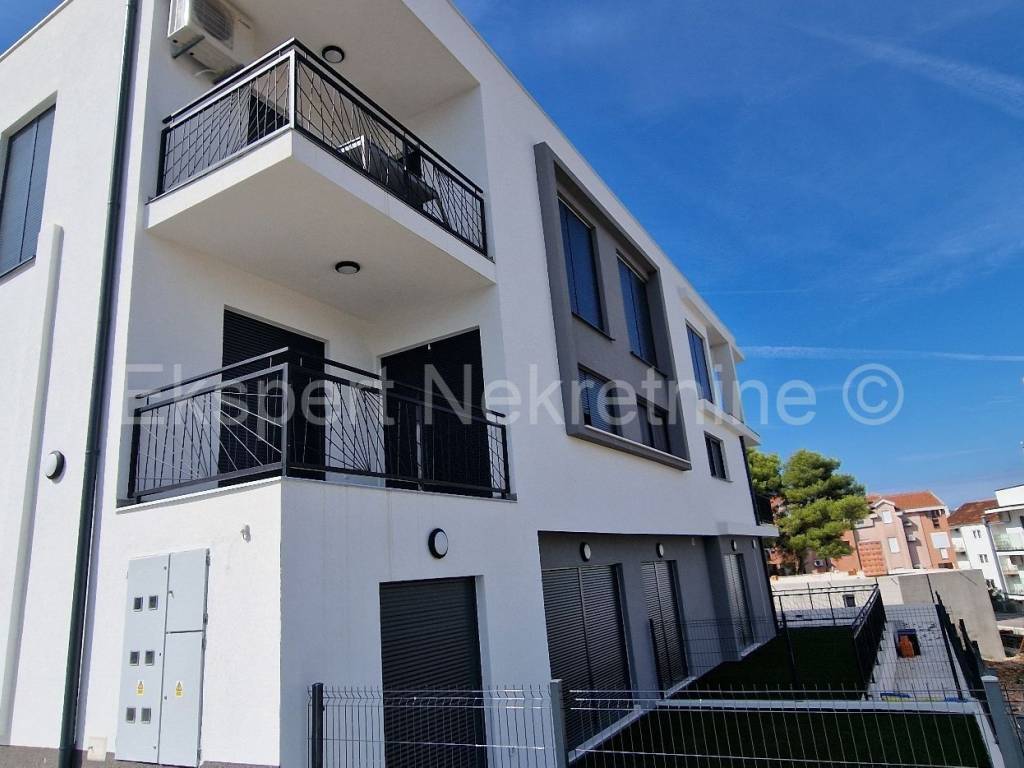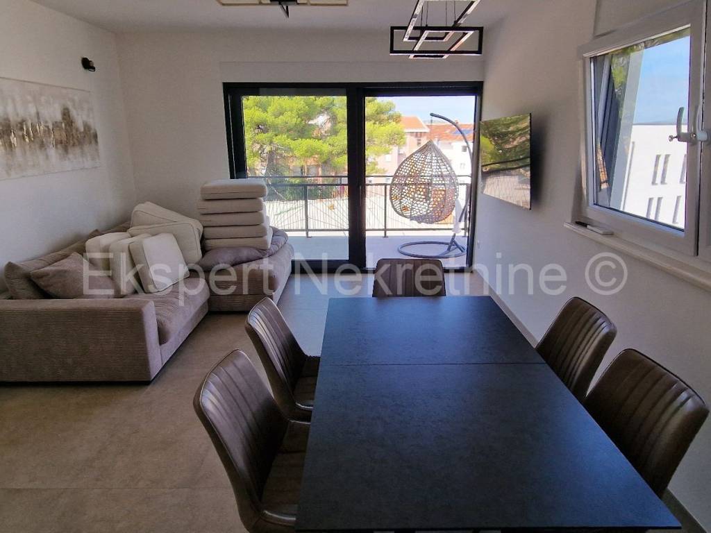 Čiovo, Okrug Gornji, comfortable two-bedroom apartment 75 m2 (58 m2 apartment + 17 m2 balcony), in a new building only 250 m away from the sea and the beach. The apartment is located on the first floor of the building and is oriented north-south-west and consists of two bedrooms, bathroom, kitchen with dining room and living room, and a large balcony of 17 m2. The apartment also has one outdoor parking space. The apartment is located in a new building that is in the final stages of construction and will soon be ready to move in. The apartment is fully furnished with new and modern furniture that is included in the price. Quality construction and equipment of the apartment (quality ceramics, underfloor heating throughout the apartment, electric shutters, air conditioning in all rooms, large glass wall in the living room, etc.). Excellent and quiet location, close to the sea and the beach.For more info, contact the agency.
