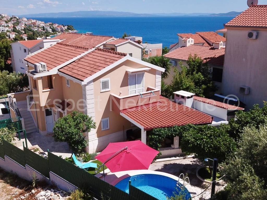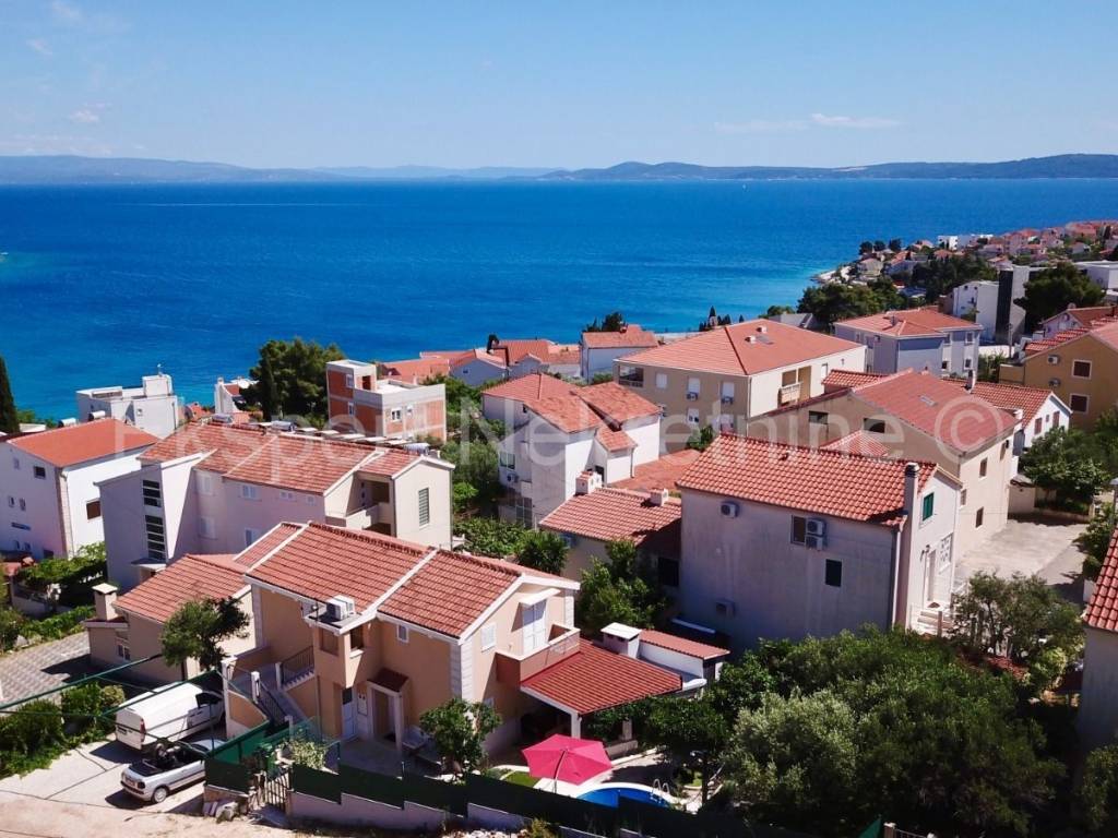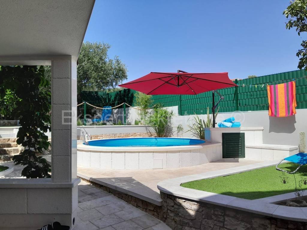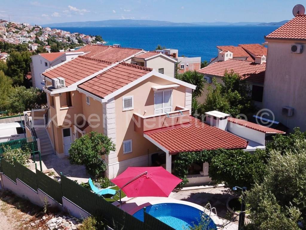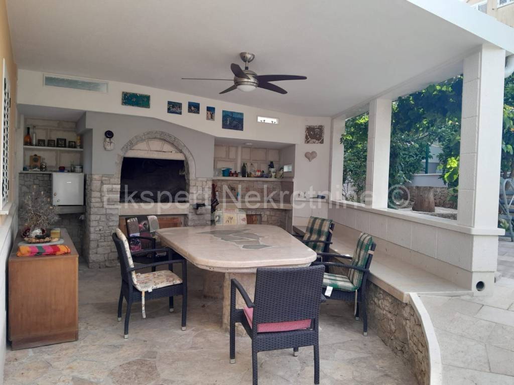Čiovo, Okrug Gornji, a small detached house of 153 m2, with 2 apartments and a swimming pool, only 250 m from the sea and the beach, with a beautifully landscaped garden. On the ground floor there is a finished but unfurnished one-room apartment, with a beautifully landscaped garden, an outdoor pool, a summer kitchen with a barbecue and a large table on a covered terrace for socializing, beautifully landscaped terraced gardens planted with Mediterranean fruit trees and herbs. while on the first floor there is a decorated and furnished two-room apartment with a large terrace. The house is only 250 m from the sea and the beach. Ideal for tourist rental due to the proximity of the beach and the sea. Quiet location. Can be moved in immediately. Ownership in order. For more information, contact the agency.