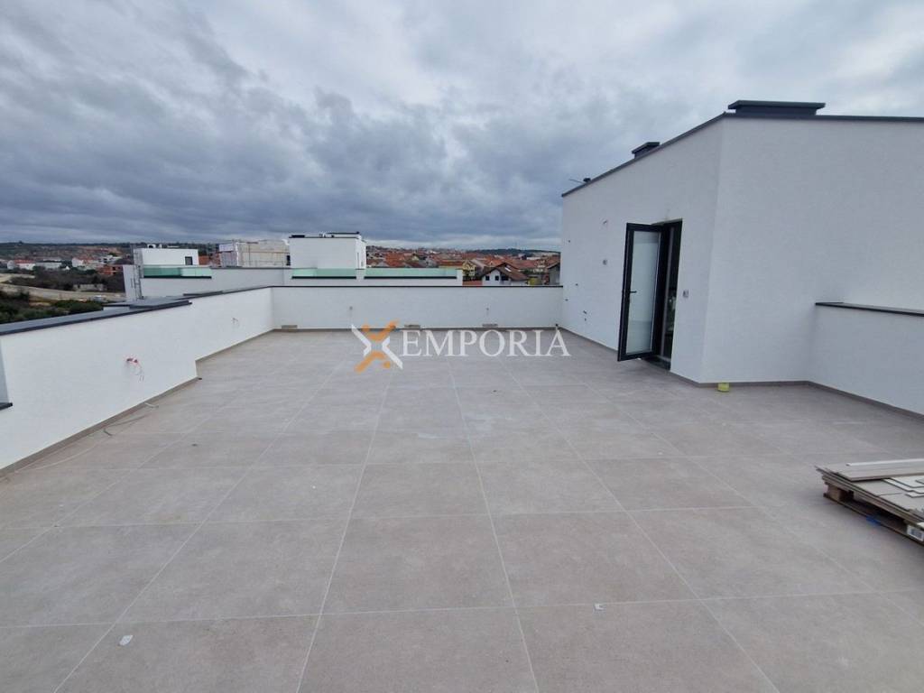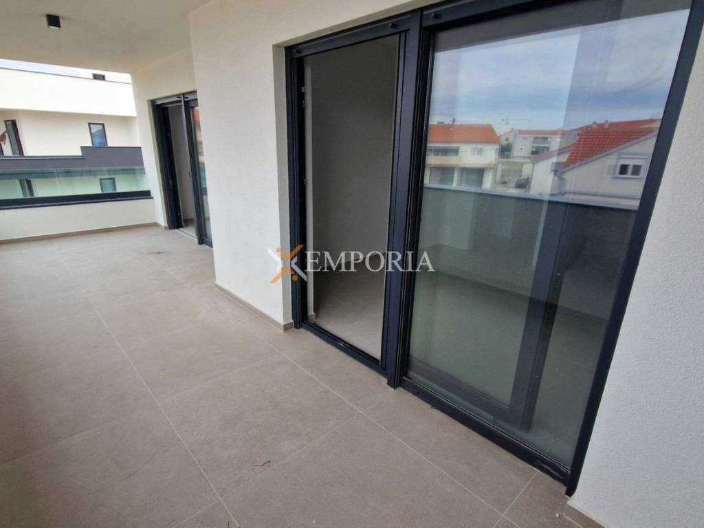 A new apartment is for sale in Zadar, located in the Crvene kuće area. The apartment is situated on the second floor of a modern residential building, which is expected to be ready for occupancy by the beginning of 2026. The building has a lift. Nearby, there will be a park with trees, walking paths, and a children"s playground.The layout of the apartment includes an entrance hall, two bedrooms, a bedroom with a bathroom, a bathroom, a toilet, a kitchen with a dining area and living room, and a loggia (95,30 m2 net). From the staircase, there is access to a roof terrace with an area of 106,63 m2. The net usable area of the described rooms is 121,96 m2.Additionally, the apartment comes with two outdoor parking spaces. The total net area, including the parking, is 127,46 m2.The property is located 1,3 km from the sea and 2,7 km from the city center.The apartment is sold fully furnished.