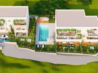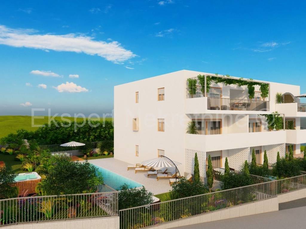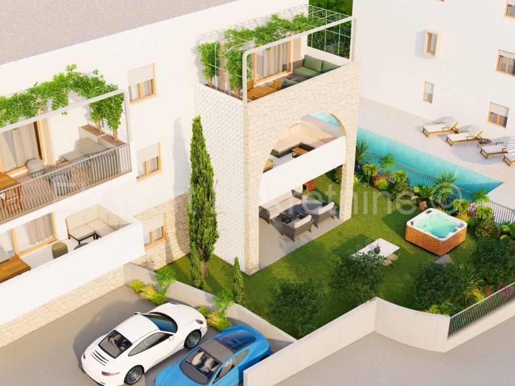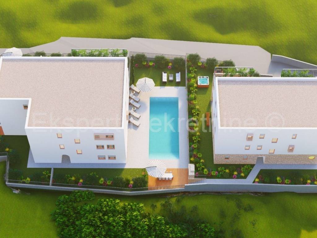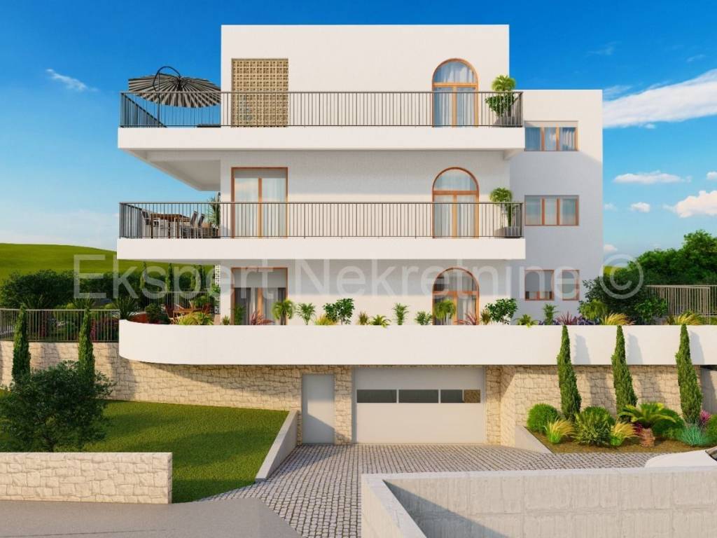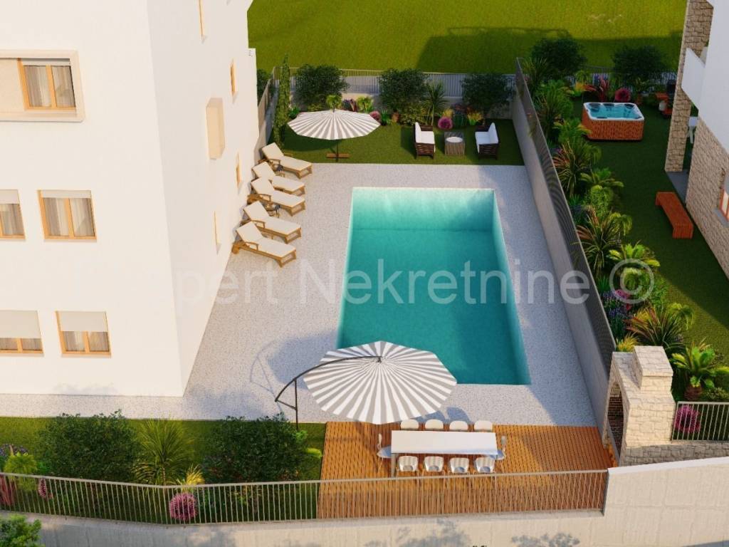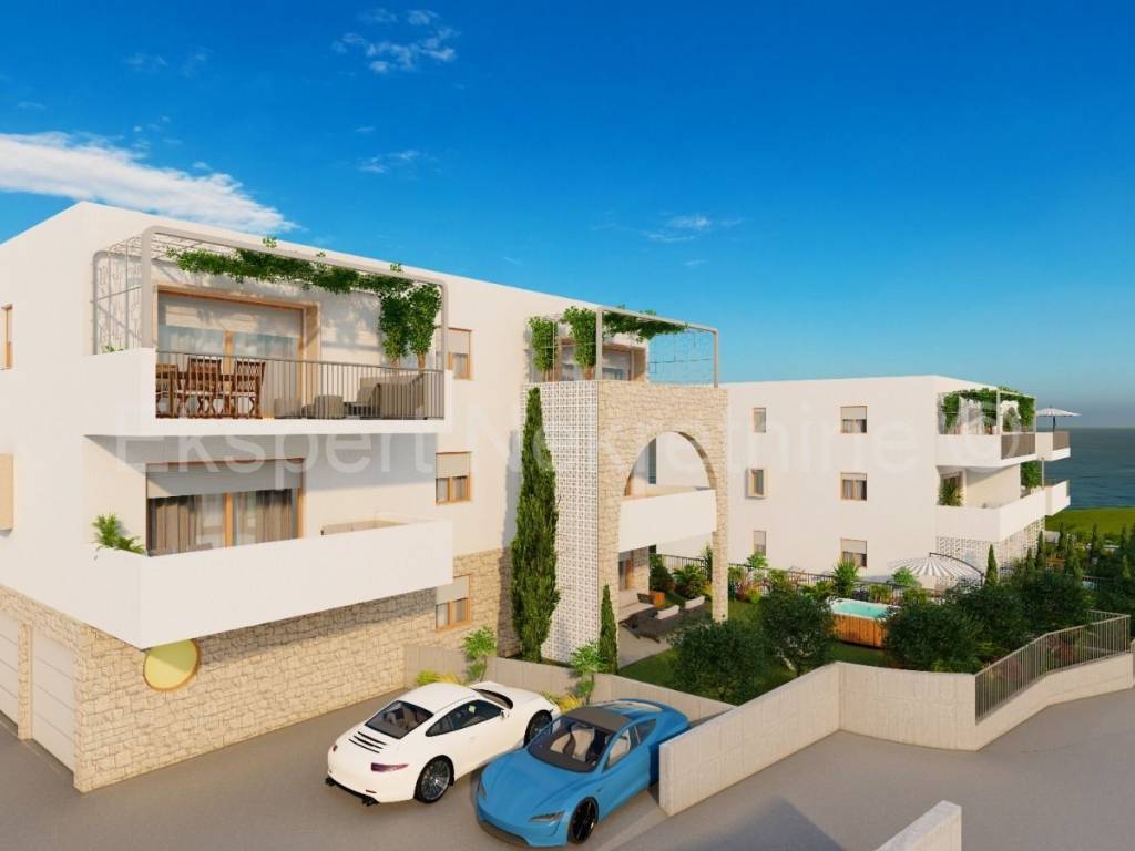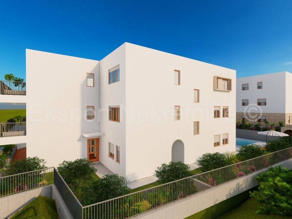 Čiovo, Slatine, two-room apartment 94 m2 in a new building with a swimming pool. The apartment is located on the second (back) floor of the building and the orientation of the apartment is east-north-west. It consists of a hallway, a kitchen with a dining room and a living room, two bedrooms and two bathrooms. and large terraces (15m2). The building consists of 5 residential units and a shared pool, and is only 60 m from the sea and 100 m from the beach. The apartment has one garage and one outdoor parking space. The planned start of construction is January 2024, and completion 20 months later.Each residential unit is equipped with air conditioning in all areas and underfloor heating in the bathroom with the possibility of upgrading. Excellent location in the center of town, close to the sea and the beach and all amenities. Close to SPLIT AIRPORT (11 km), Trogir (7 km) and the city of Split ( 30 km) For reservations and more information, contact the agency.