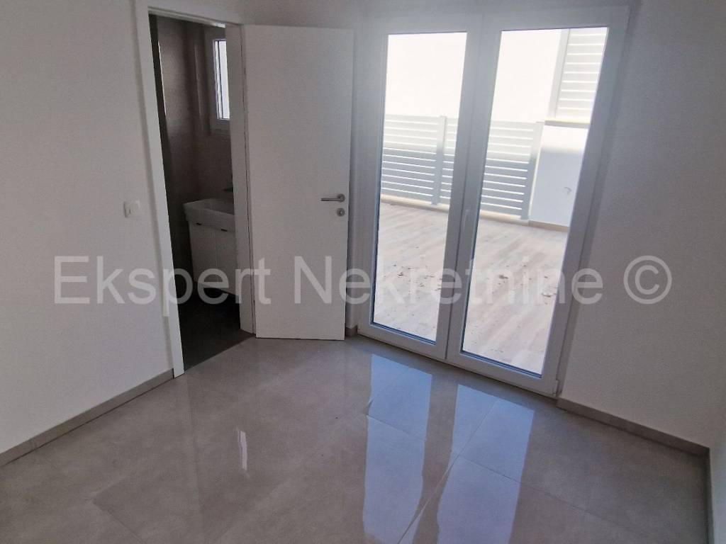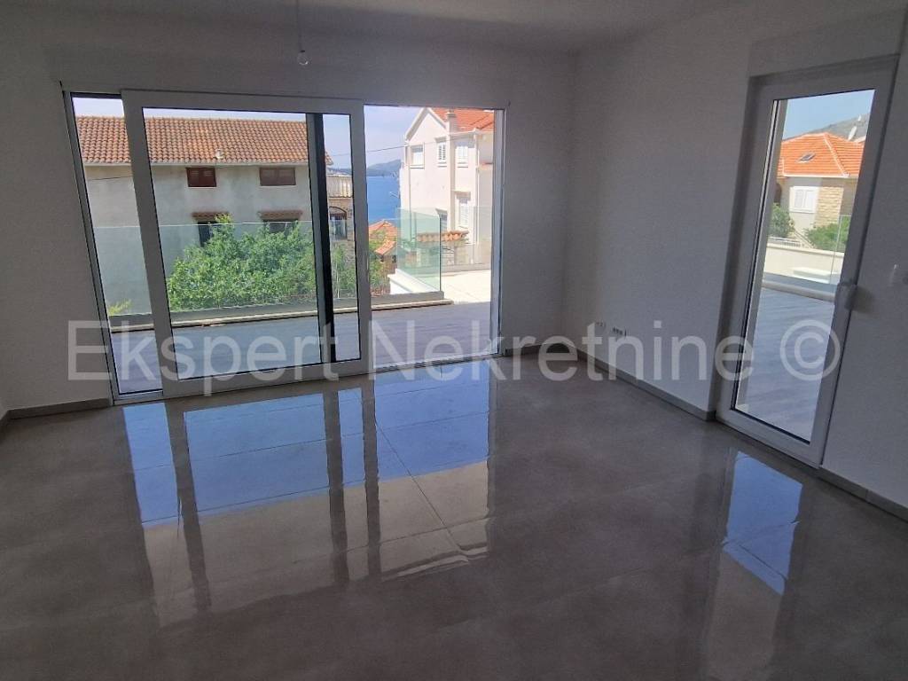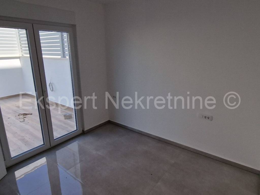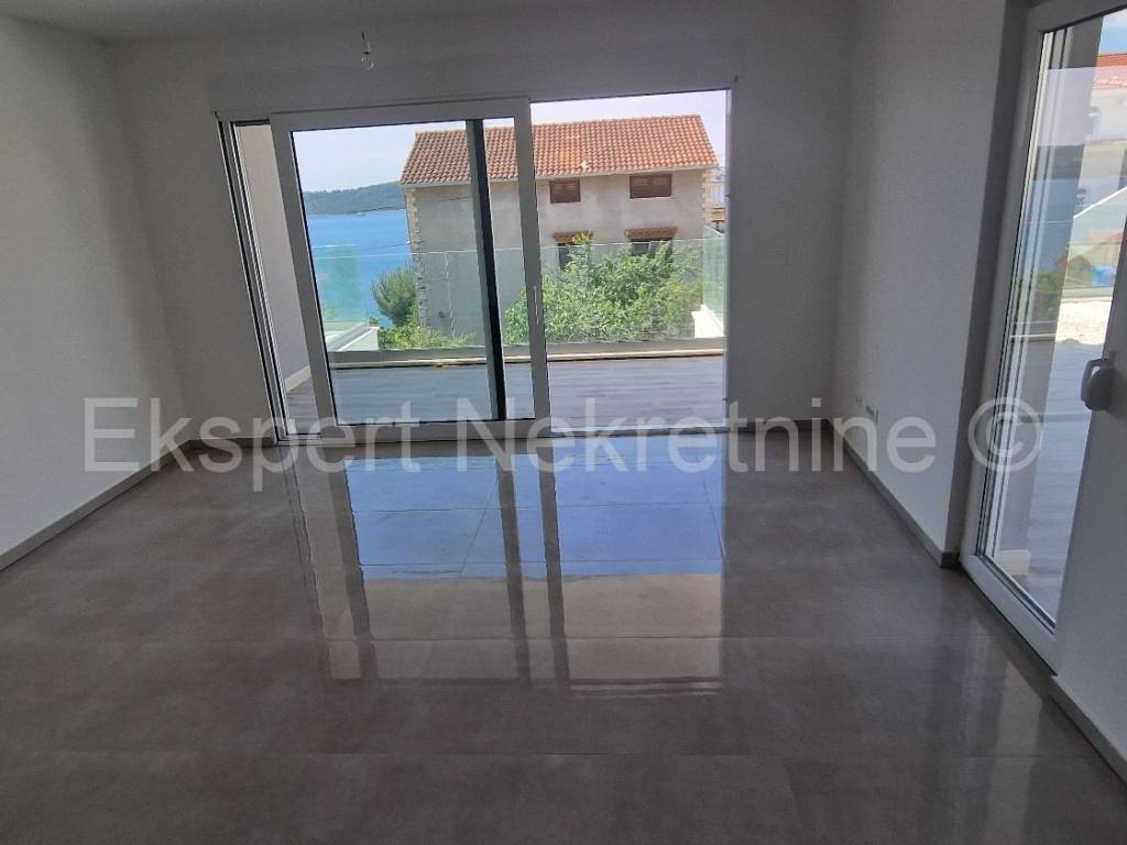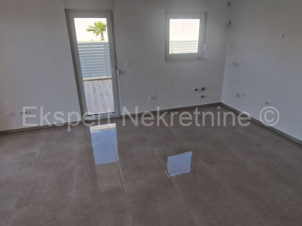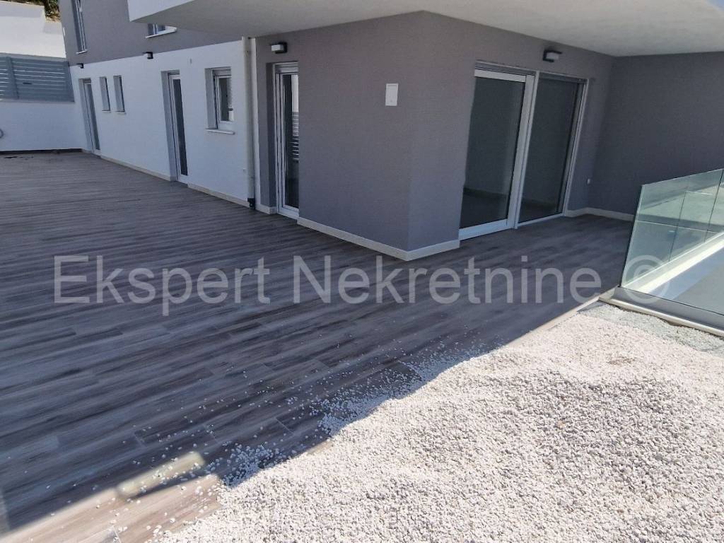 Trogir, Čiovo, Saldun, two-bedroom apartment 85 m2 (55 m2 + 30 m2 terrace) + garden 63 m2 in a new building in a smaller residential building with only 6 apartments and garages. The apartment is located on the ground floor of the building, oriented north-south-west, and consists of consists of two bedrooms, one with its own bathroom, hallway, bathroom, kitchen with dining room and living room, and a large terrace (30 m2) and a garden of 64 m2. The apartment also has one garage parking space with the possibility of buying an additional one for 20,000 euros. .The building is in the stage of rough work, and the planned completion is at the end of 2024. Quality construction (quality ceramics, PVC carpentry with insulated glass, electric shutters, air conditioning, underfloor heating, etc.). The building is only 150 m from the sea and beaches. Peaceful and quiet location with a view of the sea and islands. Neat ownership. Payment by agreement. For more information, contact the agency.
