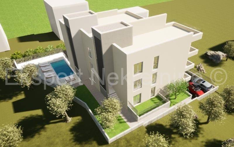 Čiovo, Okrug Gornji, two-room apartment 78 m2 + 77 m2 roof terrace with a panoramic view of the sea in a new building with a swimming pool. The apartment is on the second (back) floor, it is south-west oriented, and consists of two bedrooms, a bathroom, hallway, kitchen with dining room and living room and a large terrace (17 m2) with a view of the sea and a large roof terrace (77 m2) with a panoramic view of the sea. Completion is planned for the spring of 2024. Quality construction and equipment (air conditioning, PVC joinery, underfloor heating in the entire apartment, mosquito nets, security doors, etc.). The apartment is located in a great location near the big beach and all other facilities and it is 250 m from the sea. It also has one parking space. It is possible to buy a garage parking space and a storage room, which are paid for separately. Payment by construction stages. For more information, contact the agency.