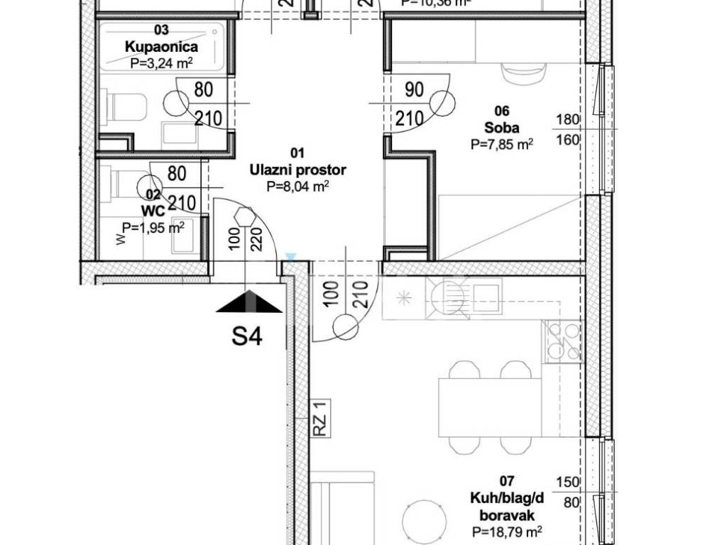 Stan P4S4 se sastoji od dnevnog boravka s kuhinjom i blagovaonicom spojenima u open space koncept, 3 spavaće sobe, ulaznog hodnika, kupaonice s WC-om, gostinjskog WC-a i natkrivenog balkona. Pripadaju mu spremište, garaža, vanjsko parkirno mjesto i krovna terasa.