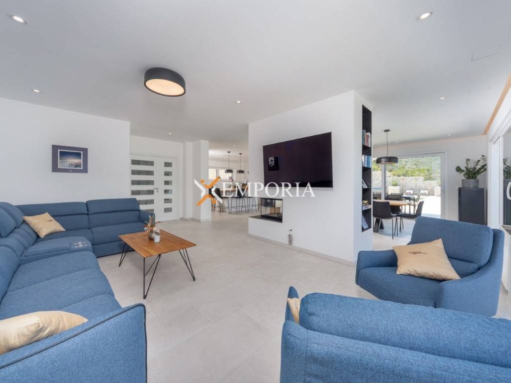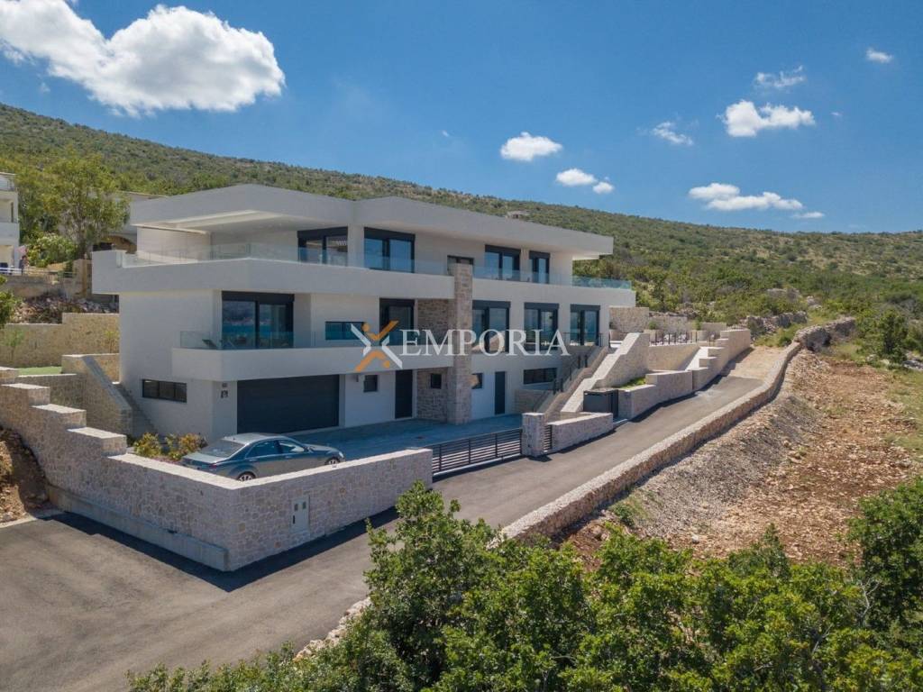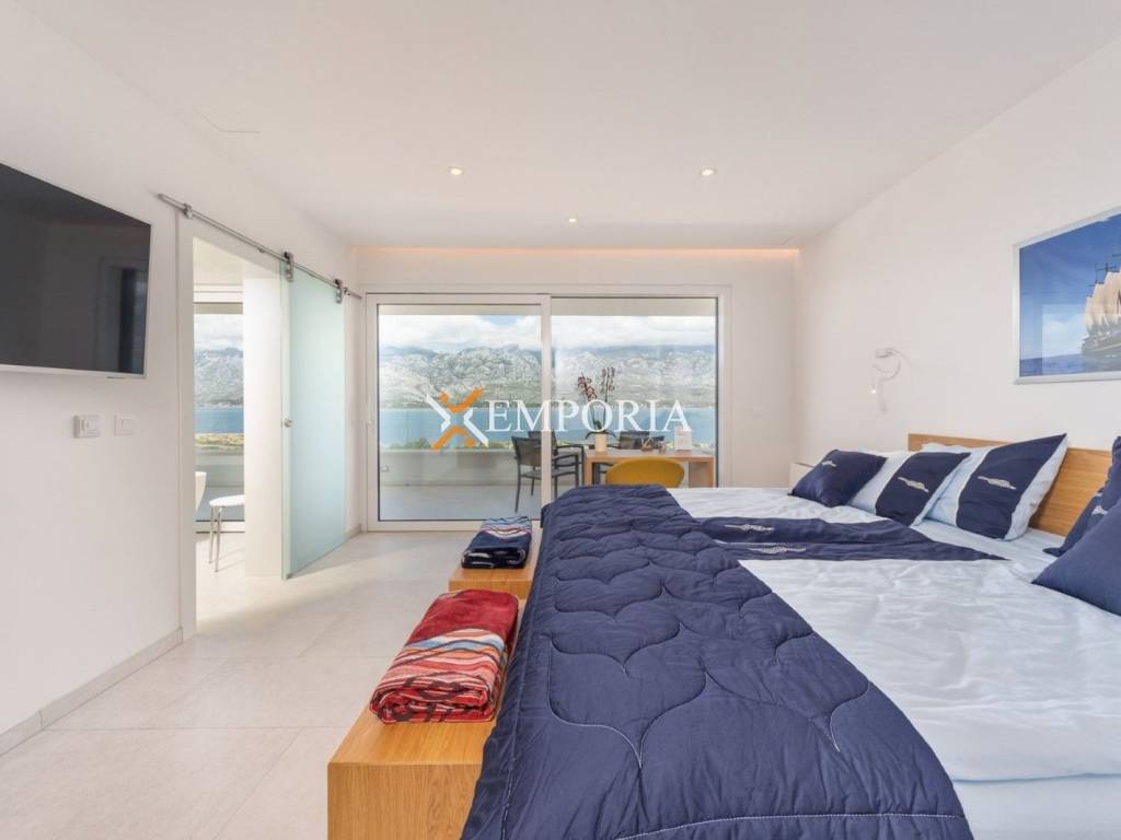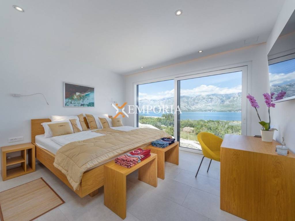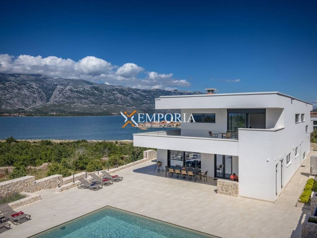 An exceptionally luxurious and modern villa with a pool and unique panoramic views of the sea is for sale. This beautiful villa is located in the idyllic and picturesque place of Vinjerac, a small coastal settlement that takes your breath away with its natural beauty and peaceful surroundings. The property is just 250 meters away from the crystal-clear sea and enchanting beaches, ideal for relaxation and enjoying the natural beauty. It is categorized with prestigious 5 stars, reflecting its top quality and exclusivity.The view from the villa and its yard is simply enchanting. It stretches toward the blue Podvelebit Channel, the old center of Vinjerac, Velebit Mountain, and the Paklenica National Park. The quality rest and peace that this truly special property provides in this wonderful location, surrounded by greenery and in close proximity to the sea, are invaluable.Luxury is embedded in every detail of this house, which has been carefully designed, decorated, and furnished. The spaciousness of the villa is confirmed by the total net usable area of 665,50 m2, situated on a plot of land measuring 1060 m2. It consists of three floors: ground floor, first floor, and second floor. The villa has 6 bedrooms, 6 bathrooms, and 3 separate toilets. There are 3 parking spaces in the yard, with an additional 2 in the garage.This is a completely new property, finished in the summer of 2019, and the quality construction ensured an energy certificate A.The modern design is distinguished by simple, straight, but carefully arranged lines, numerous glass walls, open spaces with light stone and ceramics.The villa offers luxurious accommodation for up to 12 people, suitable for private use, but also for business purposes and tourism. Due to the practical layout, the buyer can easily adapt the villa into two residential units – one would be located on the ground floor and first floor, while the other would be on the second floor.Room LayoutThe ground floor consists of a garage, entrance area and hallway, laundry room, two storage rooms, a fitness room with a sauna and shower area, and a bedroom with an attached bathroom.On the first floor, there are stairs, a hallway, a storage room, a toilet, a living room, dining room, and kitchen. There are also 3 bedrooms, each with its own bathroom, 2 covered terraces, and one uncovered terrace. This floor also includes the pool, pool machinery room, and an additional toilet.The second floor includes stairs, a hallway, a living room with a dining room and kitchen, 2 bedrooms with their own bathrooms, a toilet, as well as covered and uncovered terraces.