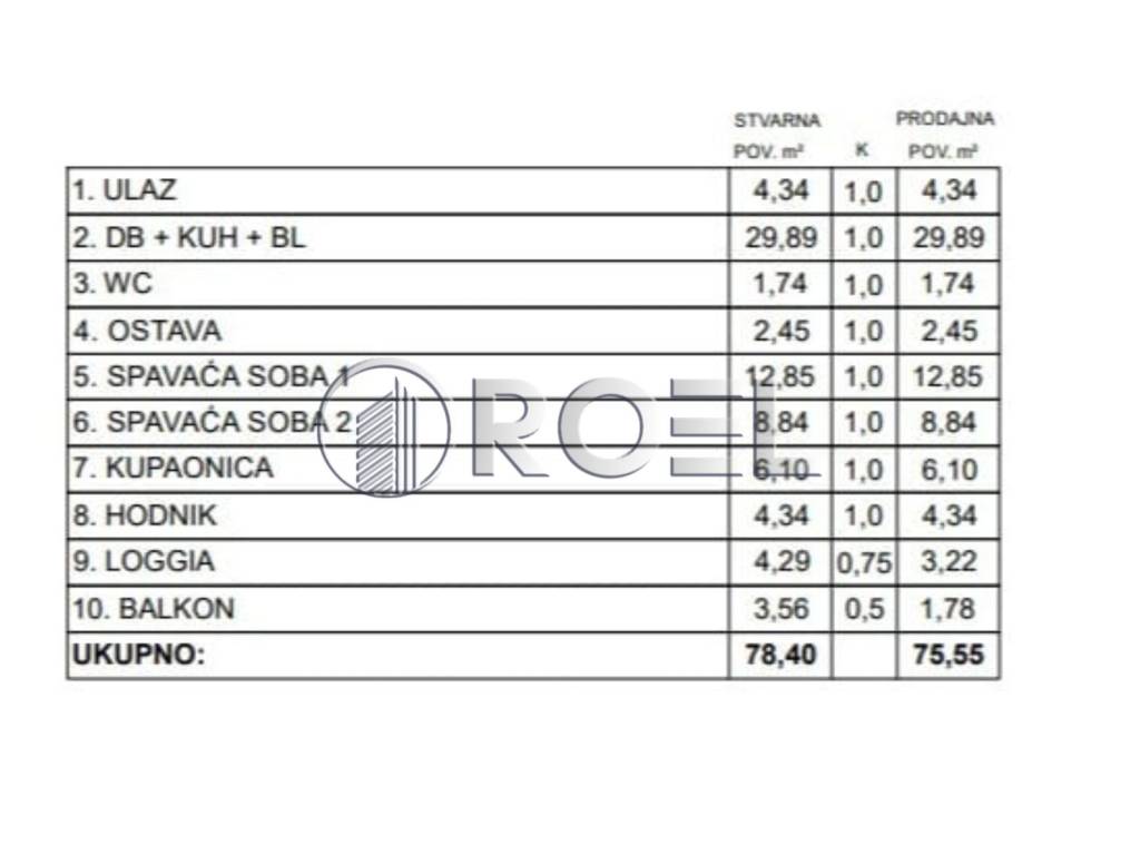 Three-room apartments (S7 and S14) are located on the first and second floors of a new building with a lift of a total of three floors in the very center of Zaprešić, NKP 75.55 m2. The apartments consist of an entrance (4.34 m2), a living room, a kitchen and a dining room (29.89 m2) with access to a loggia measuring 4.29 m2 (3.22 m2) and a balcony measuring 3.56 m2 (1.78 m2), a toilet (1.74 m2), a storage room (2.45 m2), two bedrooms (12.85 m2 and 8.84 m2), bathroom with toilet (6.10 m2) and hallway (4.34 m2). Orientation in the apartment is east. The apartments will be equipped with air conditioning, security doors, intercom, alarm system and external aluminum joinery with three-layer glass, electric blinds and mosquito nets. The floor will be covered with parquet and ceramics.