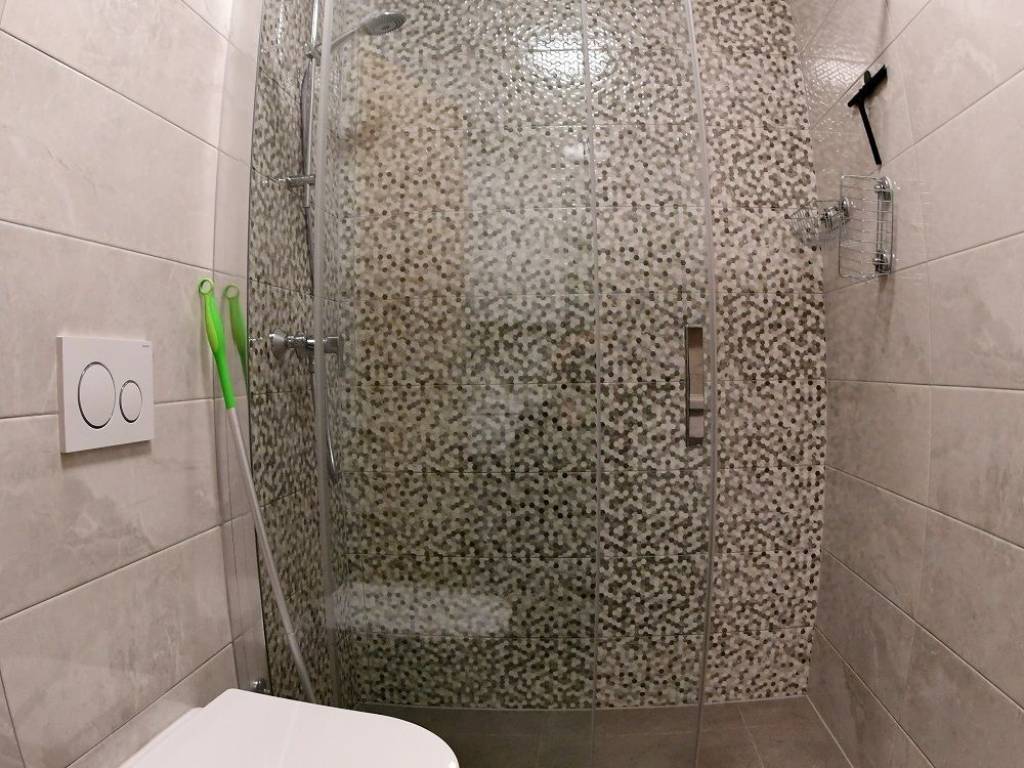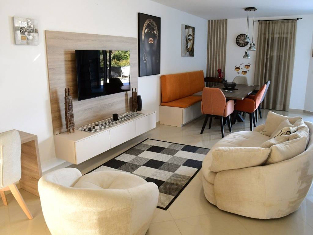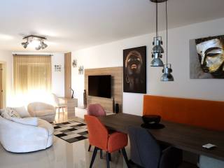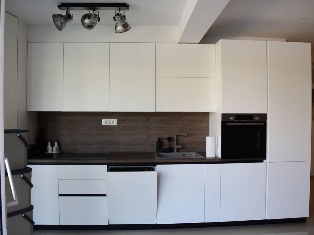 The apartment is full of natural light thanks to large glass walls that provide an open view of nature and the garden, creating a feeling of spaciousness and peace.