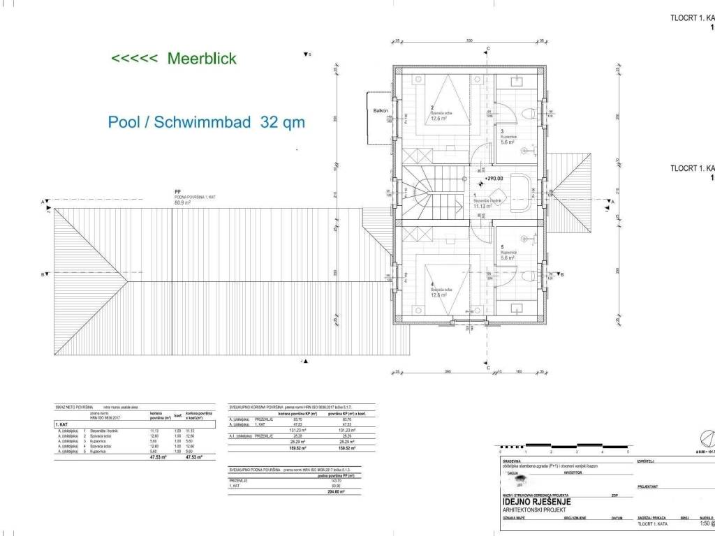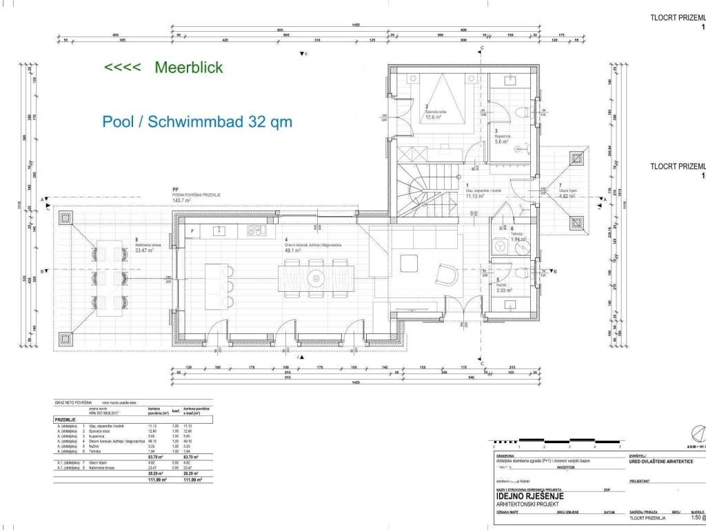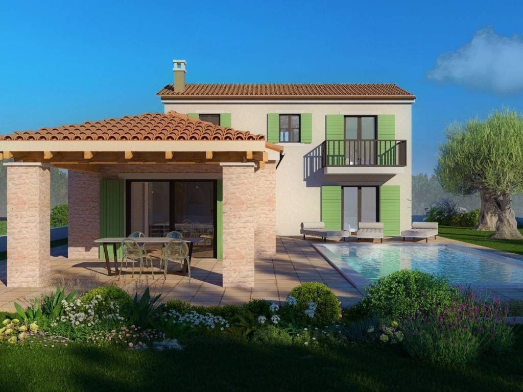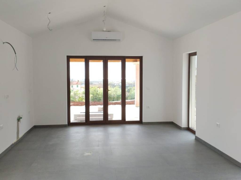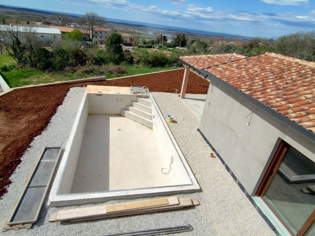 A beautiful Mediterranean house with a swimming pool under construction near Poreč and the sea is for sale.The 160 m2 house is located on a 750 m2 plot with a beautiful sea view. The ground floor of the house consists of an entrance porch, a hall, a kitchen with a dining area and a living room with access to a spacious covered terrace, a utility room, a toilet, a bedroom and a bathroom.The staircase leads to the first floor where there are two bedrooms with en-suite bathrooms.The heating and cooling of the house is regulated by a heat pump and air conditioning units installed in each room.