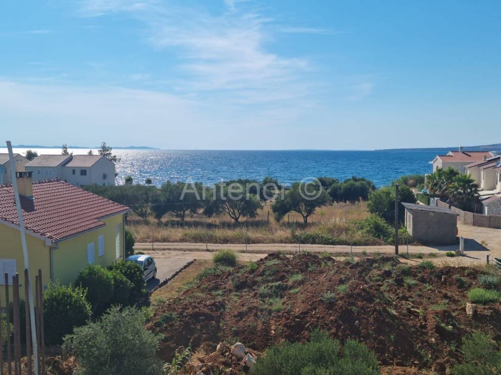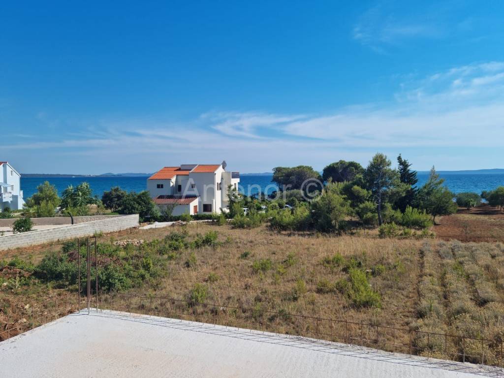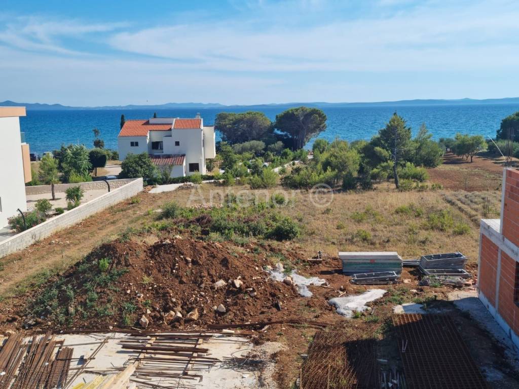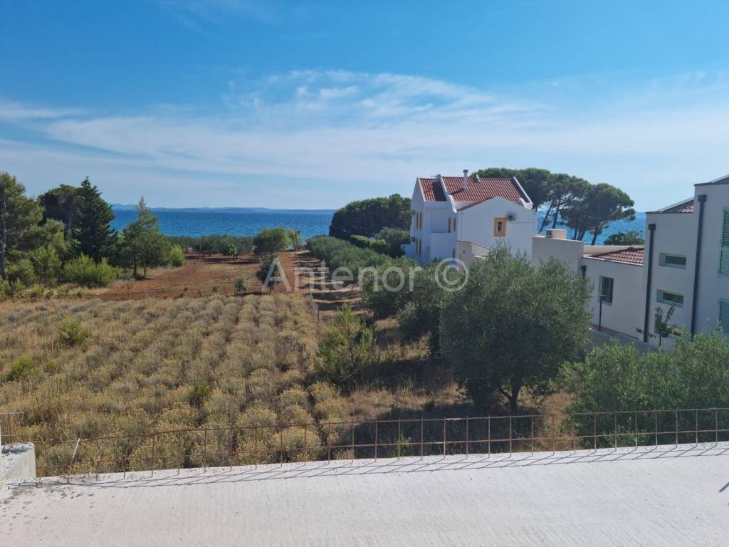 PRIVLAKA - Prodaje se apartman (S202) u luksuznom apartmanskom naselju u kojem se nalaze tri ville ( ukupno 26 apartmana ), udaljen od mora 70 metara sa prekrasnim pogledom na more, otoke i zalazak sunca. Apartman se nalazi na drugom katu, a sastoji se od hodnika, kuhinje sa blagovaonom, dnevnog boravka, kupaone, dvije spavaće sobe i terase. Apartmanu pripada i krovna terasa sa jacuzzijem. Netto površina apartmana je 95 m2.