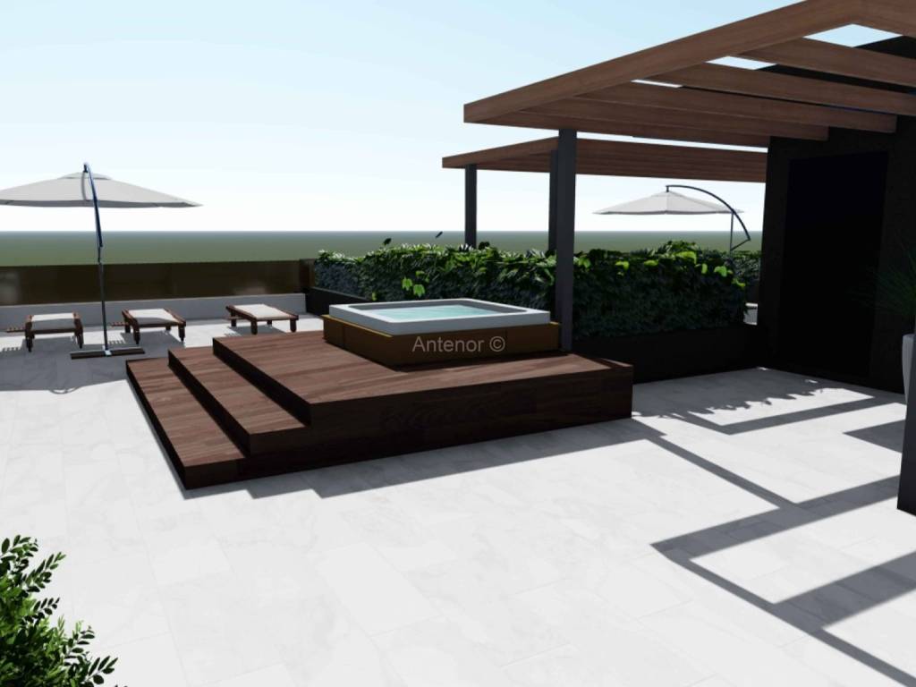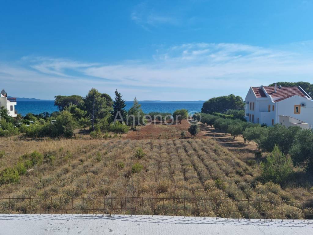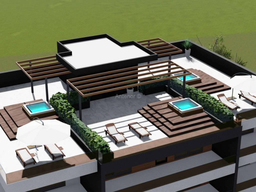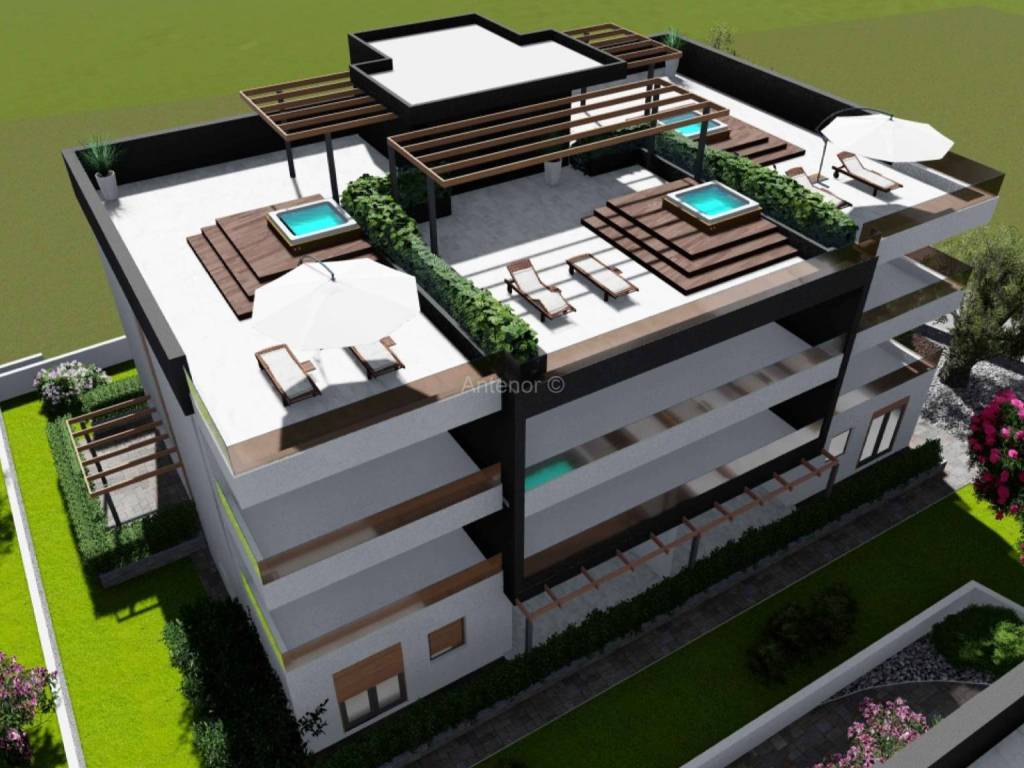 PRIVLAKA - Prodaje se apartman (S202) u luksuznom apartmanskom naselju u kojem se nalaze tri ville ( ukupno 26 apartmana ), udaljen od mora 70 metara sa prekrasnim pogledom na more, otoke i zalazak sunca. Apartman se nalazi na drugom katu, a sastoji se od hodnika, kuhinje sa blagovaonom, dnevnog boravka, kupaone, dvije spavaće sobe i terase. Apartmanu pripada i krovna terasa sa jacuzzijem. Netto površina apartmana je 95 m2.
